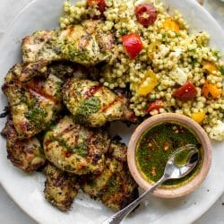 This chimichurri grilled chicken is charred and smoky and served with a refreshing couscous salad with feta and tomatoes. Delicious!
