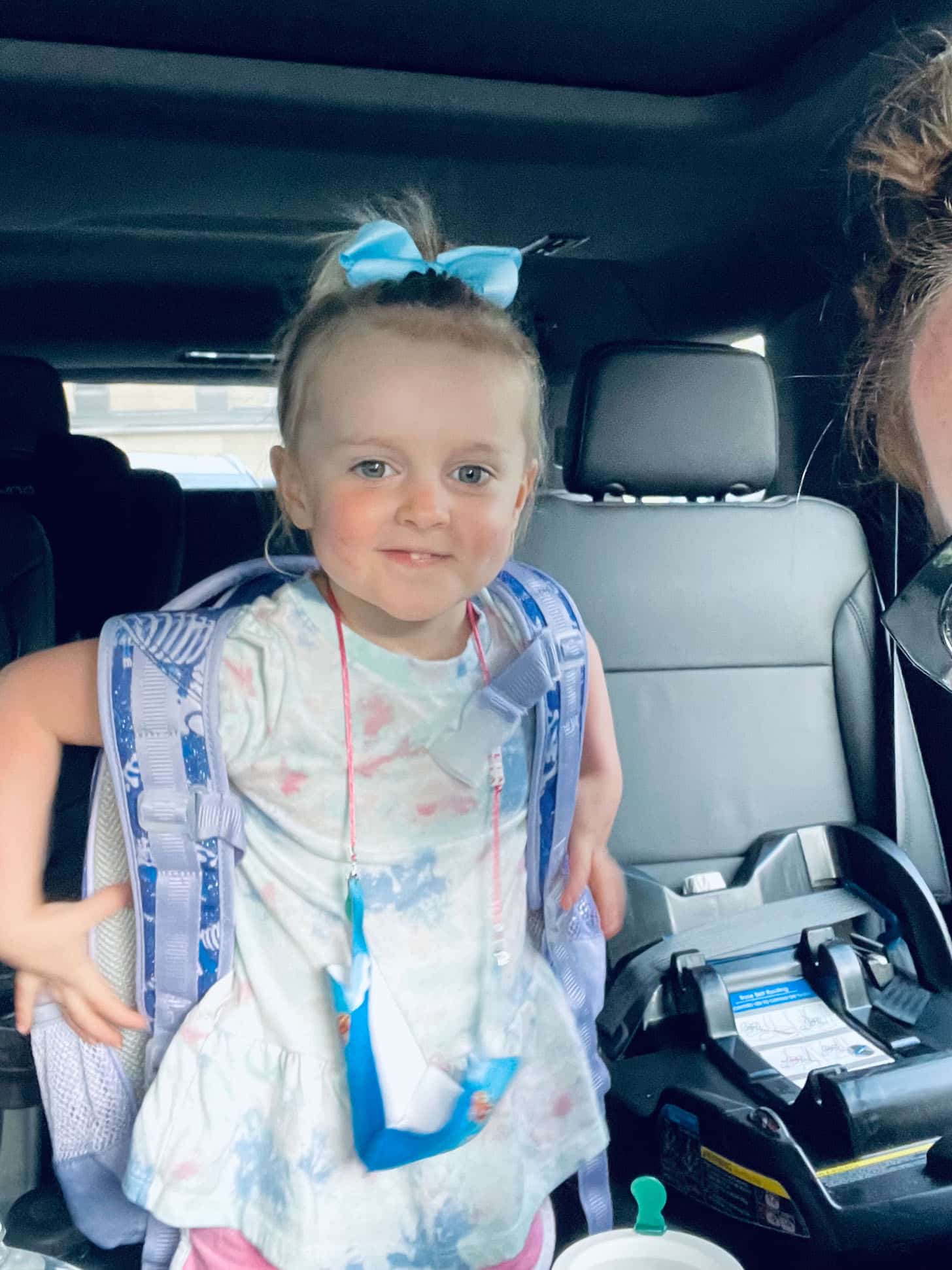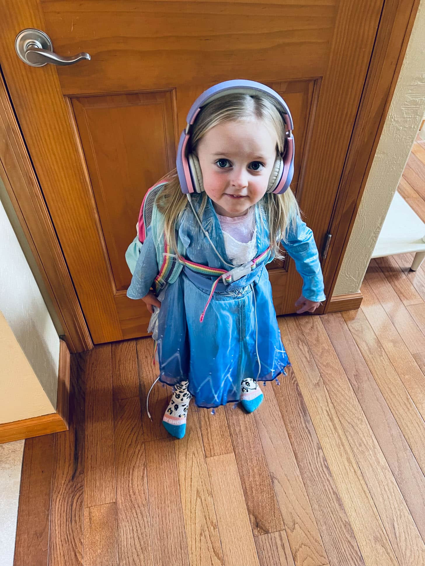 Her outfits kill me. Elsa dress, leopard socks, rainbow backpack, headphones.