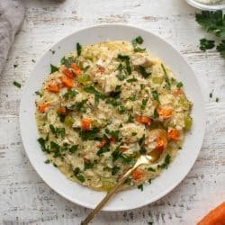 This chicken soup risotto is sponsored by ALDI! This chicken soup risotto is the ultimate comfort food. All the flavors of chicken noodle soup in a creamy parmesan risotto. It’s a serious hug in a bowl.