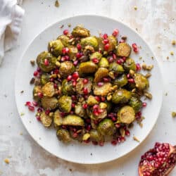 - Roast the brussels sprouts for 20 to 25 minutes, tossing once or so during cook time. Remove from the oven and place the brussels on a platter. Sprinkle with the pistachios and pomegranate arils. Serve immediately!