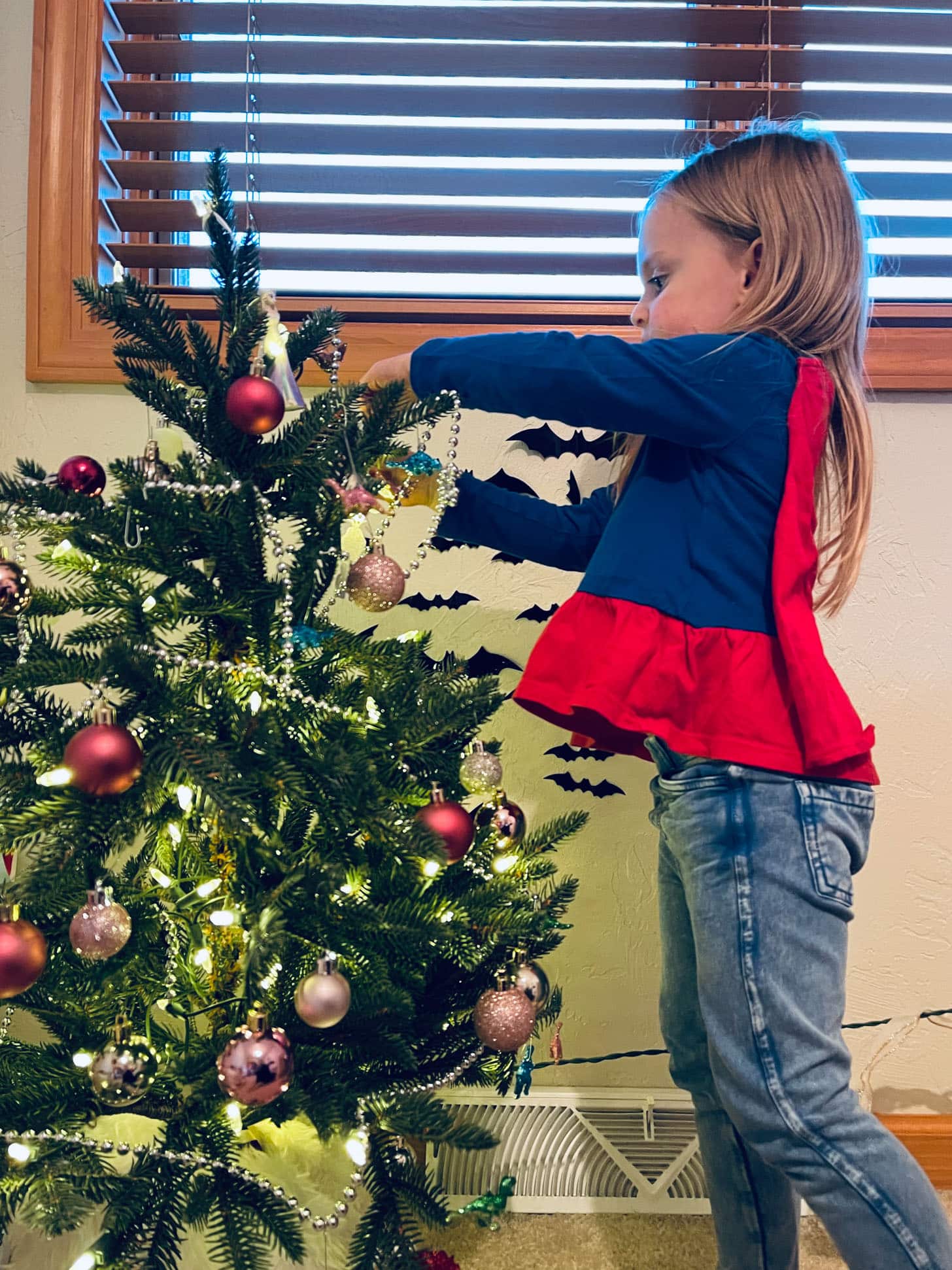 Emilia decorated her tree in her room. Note the bats from Halloween behind it.