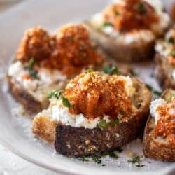 - Once the meatballs are done and bread is toasted, slather the bread with a few spoonfuls of ricotta cheese. Top with a meatball or 2 or 3! Sprinkle with fresh herbs and breadcrumbs if you wish! Serve immediately.