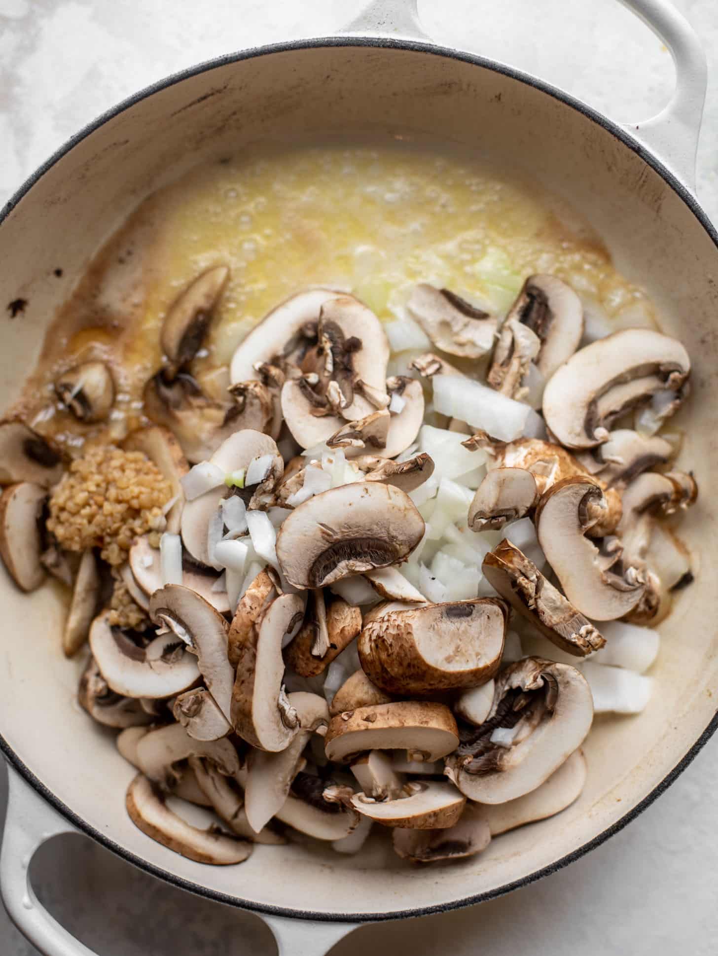 - After browning the pork chops, sauté the veggies. It gets up all the flavor bits! I start with butter, onions, mushrooms and garlic. Those classic building blocks of flavor add in SO much!