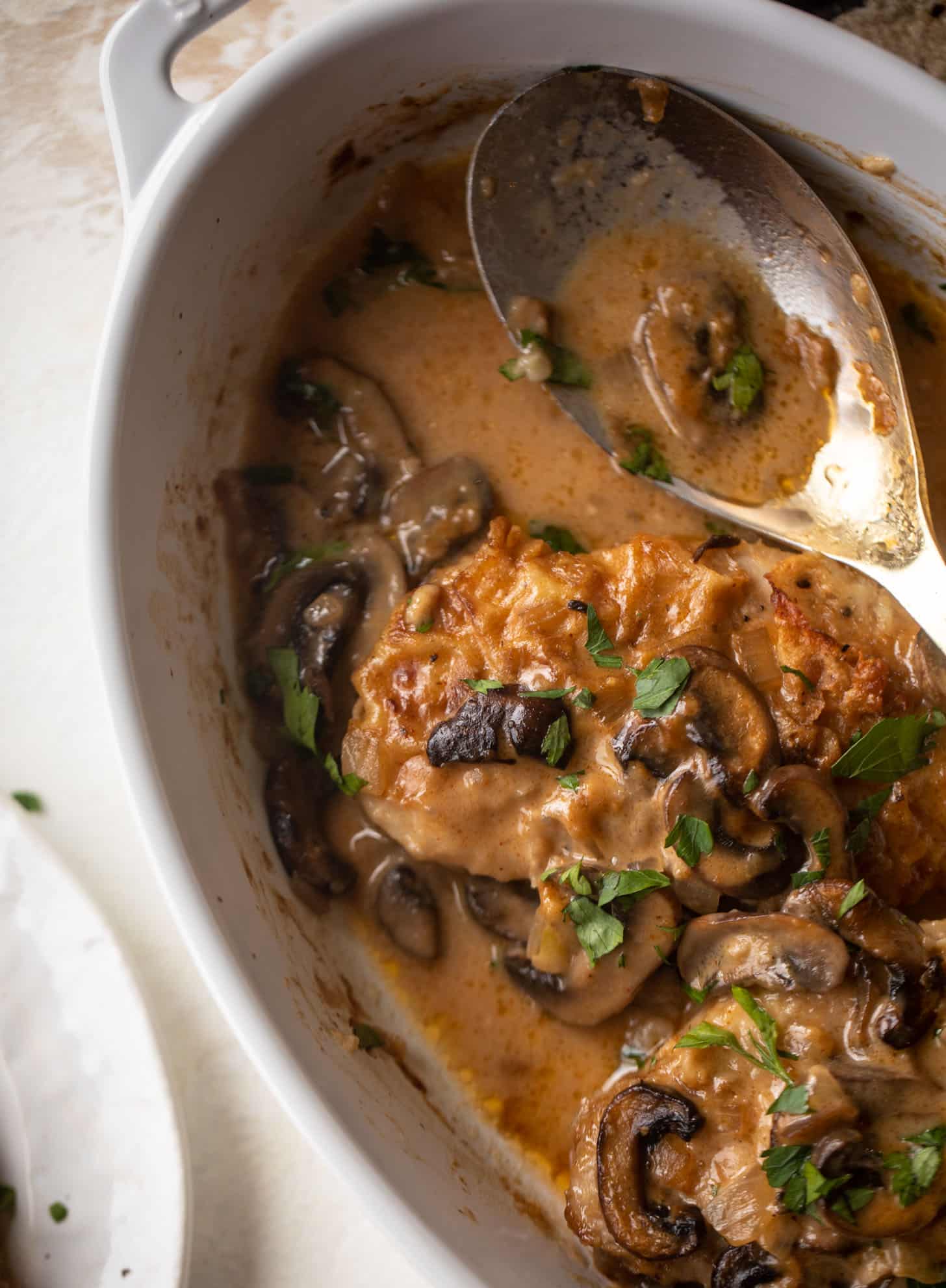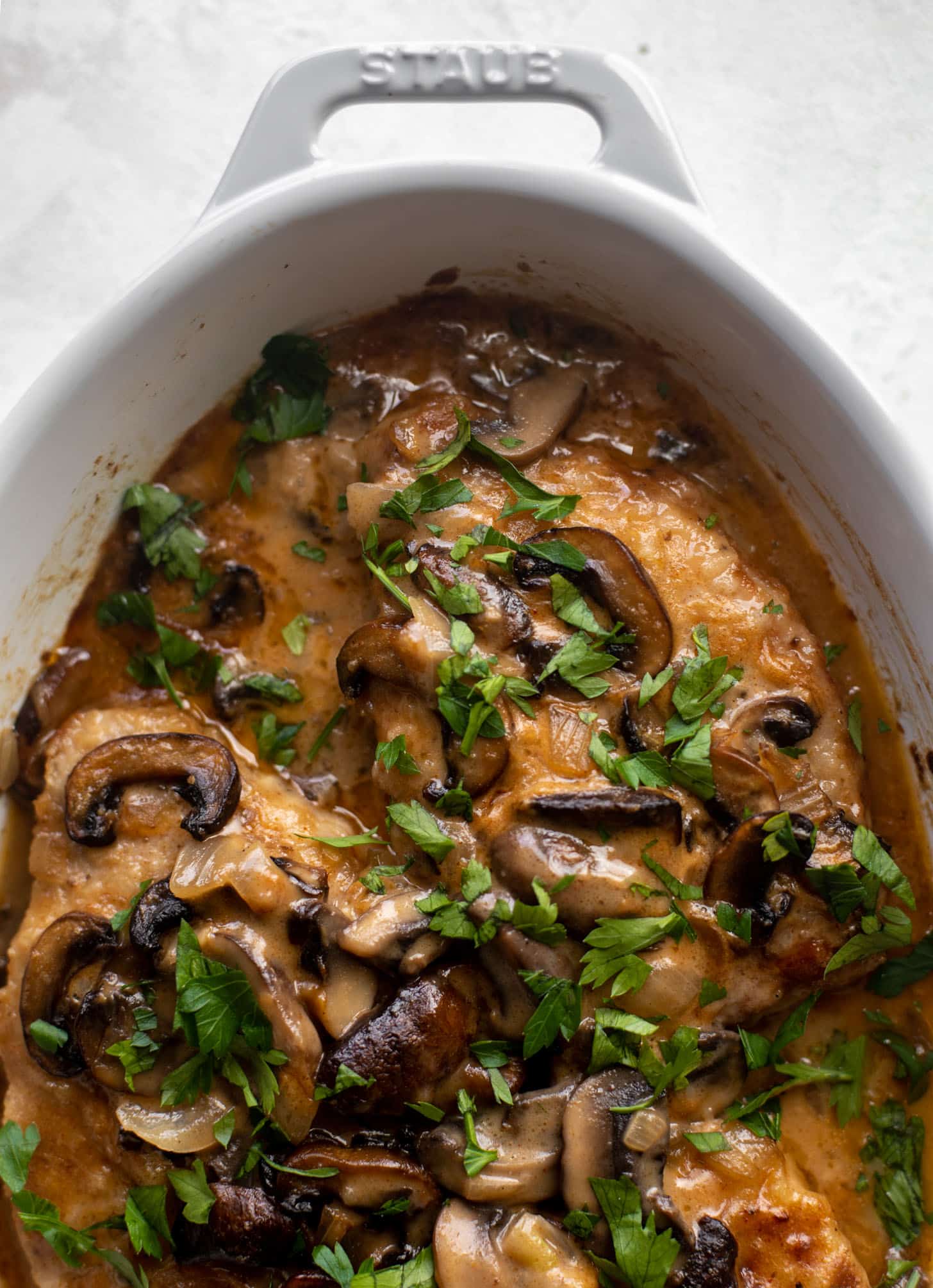 I added mushrooms too, which is something my mom has always left out of her classic marsala, even though they are traditionally there. And wow – they pair SO well with the pork. This dish is super hearty and comforting, perfect for the chilly winter days ahead.