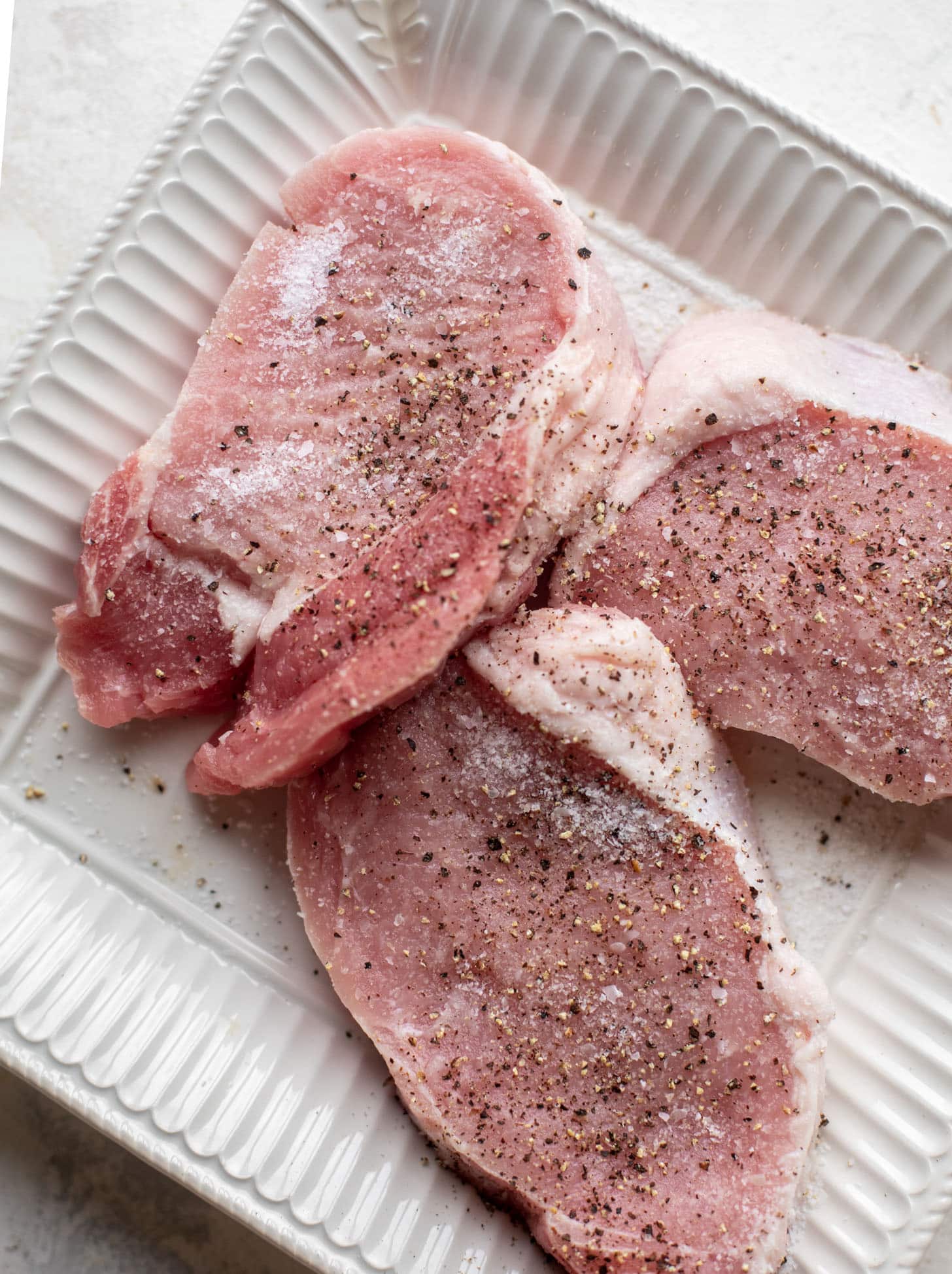 - Heat an oven-safe skillet over medium heat and add 1 tablespoon of the butter. Add each pork chop and brown on both sides, cooking about 2 minutes per side. When the pork is finished, transfer it to a plate (you can even use a paper towel lined plate - that’s what my mom does!).