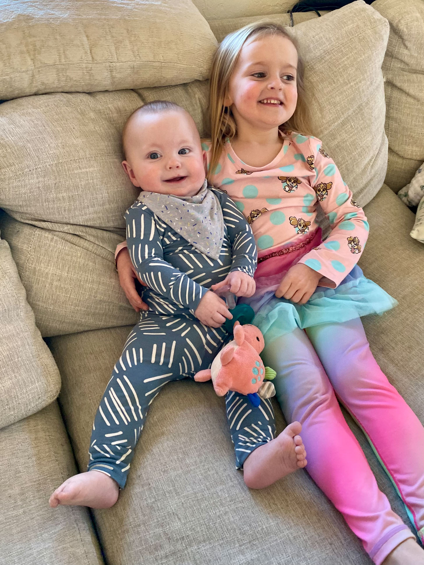Oh my goodness, where can I find that Sky paw patrol shirt? My daughter would love it! Em’s balloon sleeve sweatshirt is super cute, too!