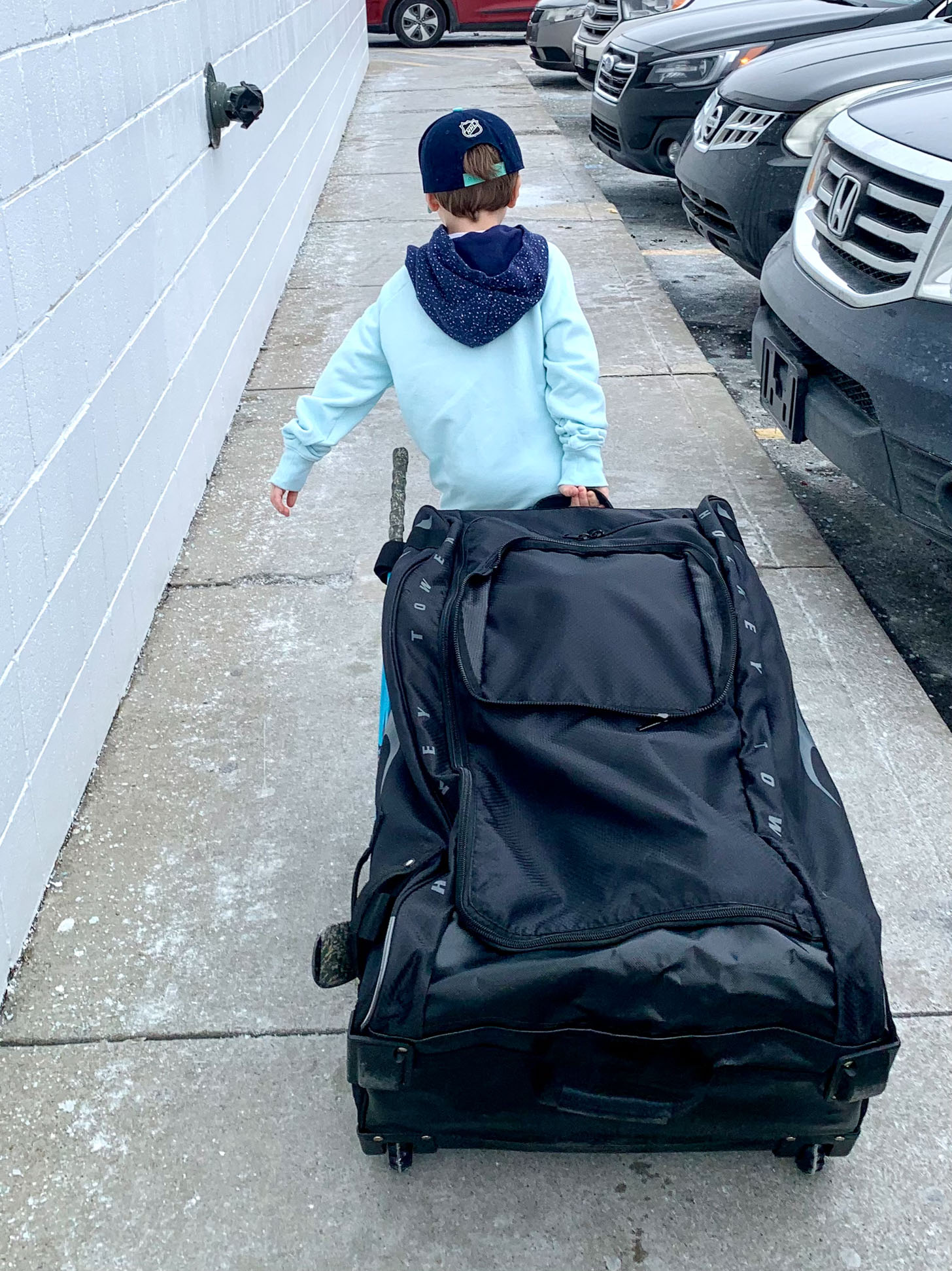 Max loves carrying his hockey bag in himself. It’s bigger than him. At least they have wheels now!