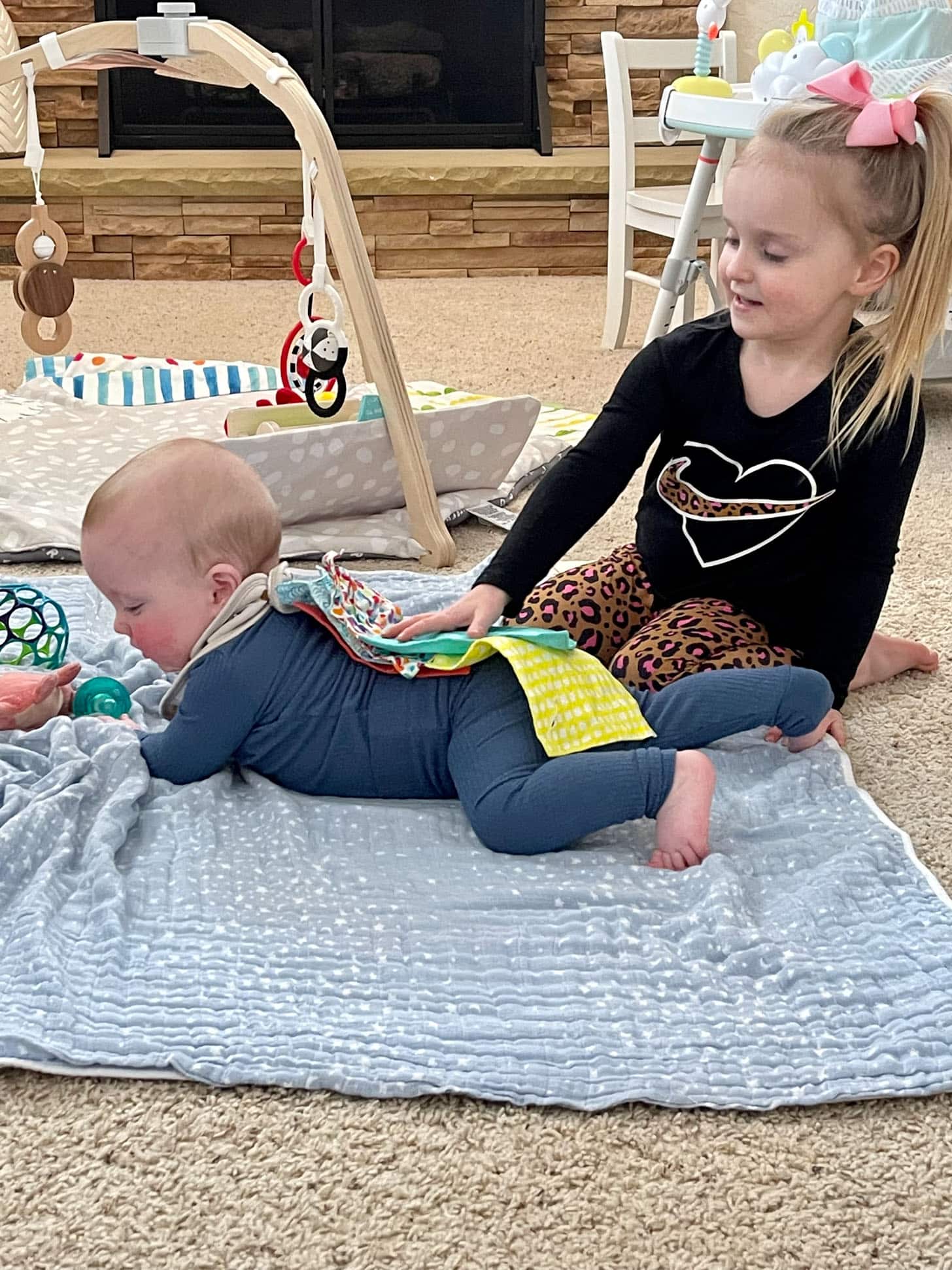 Baby brother gets lots of toys on him.
