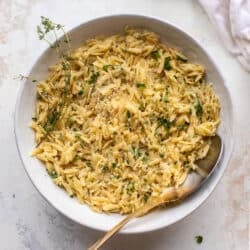 This parmesan orzo is our all-time favorite side dish! It is so incredibly versatile. It goes with everything in all seasons. Serve alongside chicken, fish, steak, beans or your favorite vegetarian dish.