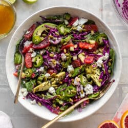 This is an awesome salad to prep ahead of time as the ingredients can hold up well (aside from the avocado!). I suggest storing the dressing separately and then mixing right before you eat. It’s also SO good with shrimp on top or even salmon.