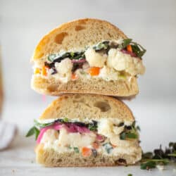This pickled veggie sandwich is my new favorite lunch! Smashed together with garlic scallion cream cheese, greens and the perfect bread, bun or roll, it’s so flavorful and very filling.