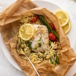 This fish in parchment packets is absolutely delicious. Lemon herb orzo and fresh vegetables are topped with a cod filet and drizzled with garlic butter. Roasted until flakey and perfect – this is satisfying and flavorful!