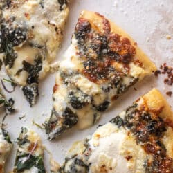Made this last night for dinner – super good! I would add another pinch of salt to my spinach when I make it again. I also used frozen spinach and just cooked out the excess water in a pan. It was kind of a pain: I cooked out the water from the spinach, took the spinach out, then did the onions, then put the spinach back in the pan. But that’s ok – it worked fine, no soggy pizza. Thanks Jessica!