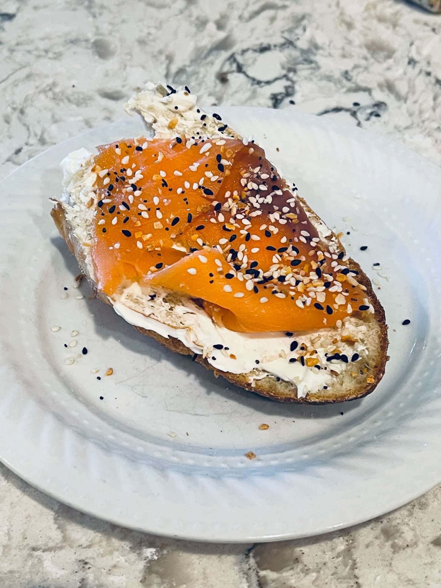 This was the best breakfast/lunch this week. Tear off some baguette, cream cheese, smoked salmon, everything seasoning.