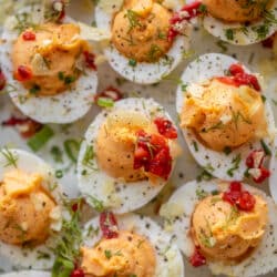 These pimento cheese deviled eggs are made with a rich pimento cheese filling, topped with sliced scallions, pimentos and crushed potato chips for extra crunch and flavor!