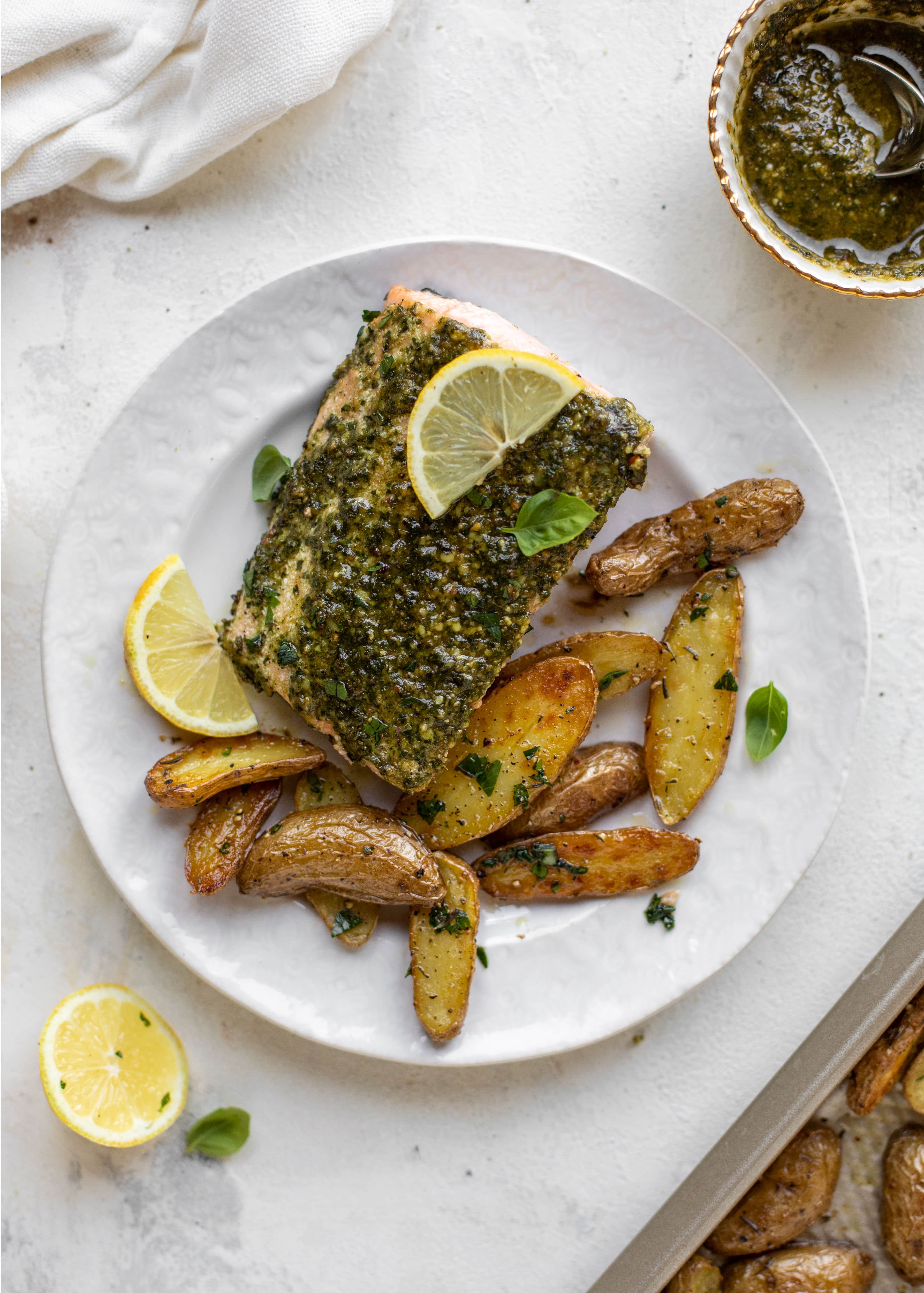 Sheet pan salmon with lemon thyme potatoes is next. The flavor is out of this world.