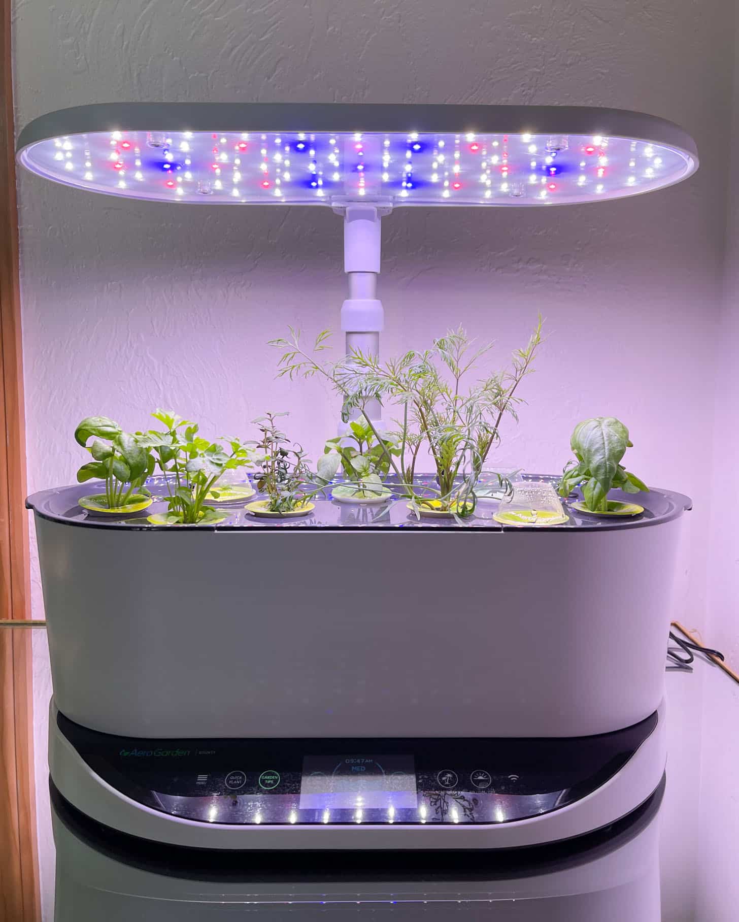 This is a peek at my aerogarden from last week – the herbs have already doubled again!