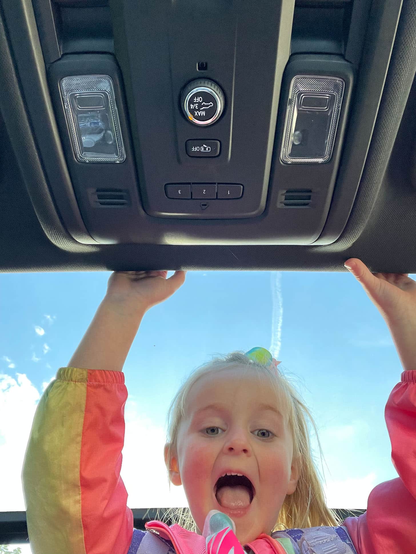 She loves having the windows and the sunroof open in the car in her dropoff line at school.