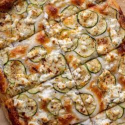 This is the summer version! It’s loaded with thinly sliced zucchini, lemon, goat cheese and garlic. It is so super fantastic.