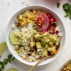 We love these grilled chicken rice bowls! The chicken is juicy and flavorful, marinaed in cilantro lime dressing. The bowl is filled with corn, tomatoes, avocado and pickled onions. Super easy and leftovers are great!