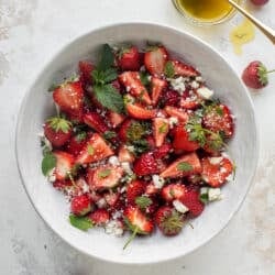 Sure, the berries right now are so perfect on their own – almost unrealistically sweet and juicy! But adding a few ingredients takes them over the top. This strawberry feta salad elevates that plain bowl of berries and is also a fab way to get some savory flavors into your fruit.