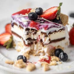 This triple berry ice cream cake is the perfect dessert to serve for the fourth of July. It’s red white and blue, chilled and refreshing for the hottest of summer days and uses lots of fresh, vibrant berries. It is a hit every time!