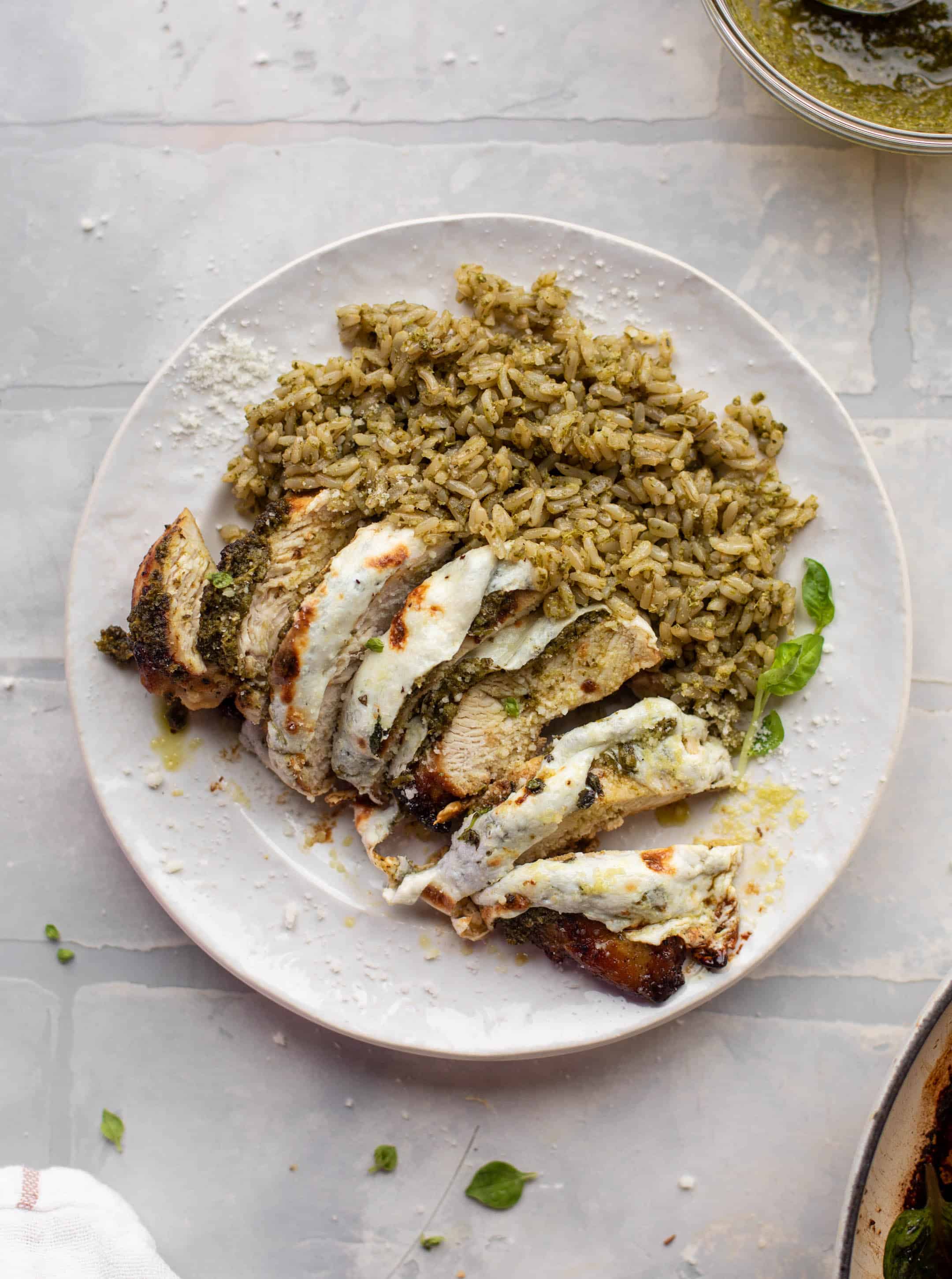 This chicken is embarrassingly easy. The pesto on top browns a bit in the oven, so don’t be alarmed. It’s covered by cheese, so you’ll barely notice!