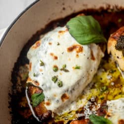 Then I throw the whole skillet in the oven! I like to sear the chicken in an oven-safe skillet so I can use the same pan the whole way through. Bake until the cheese is melty and the chicken is 165 degrees F, then serve! Ooooh it’s good.