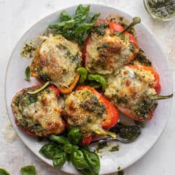 Another great recipe! I used a combination of basil pesto and sun dried tomato pesto and roasted an onion along with the peppers ( adding them into the rice before stuffing the peppers). Easy, low maintenance weekday meal. Thank you!