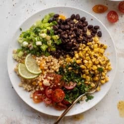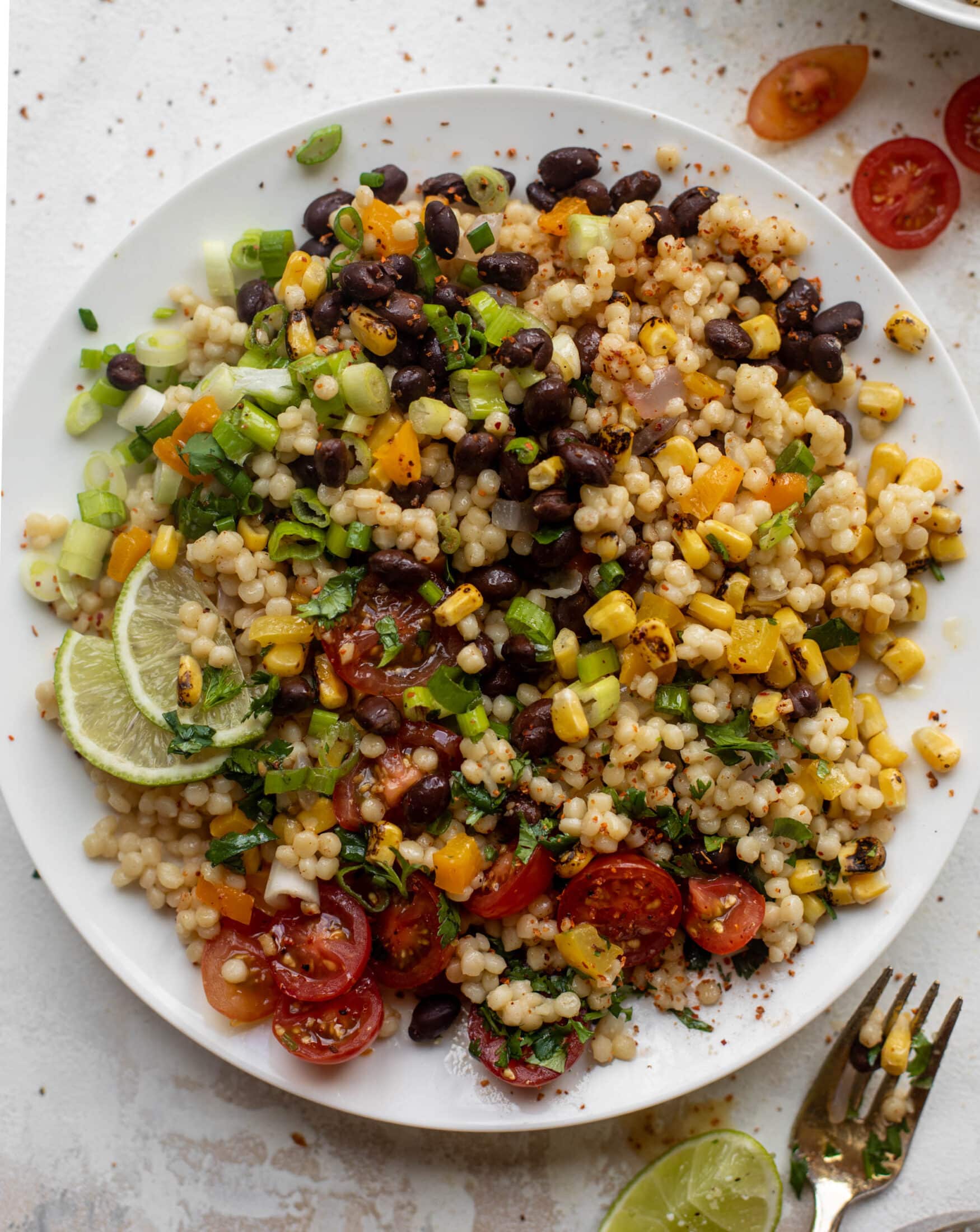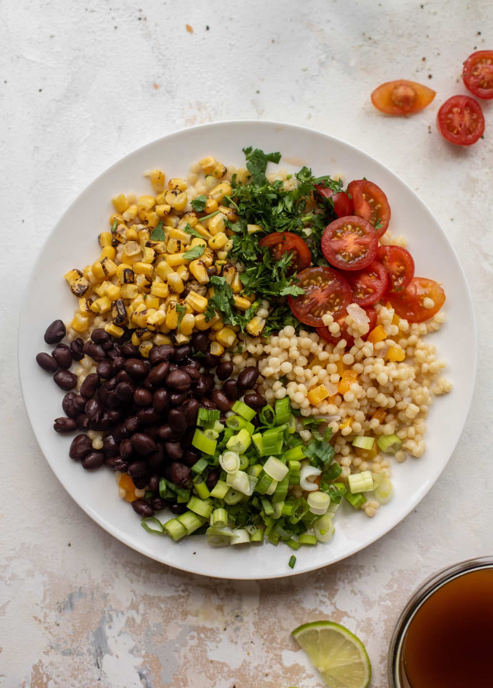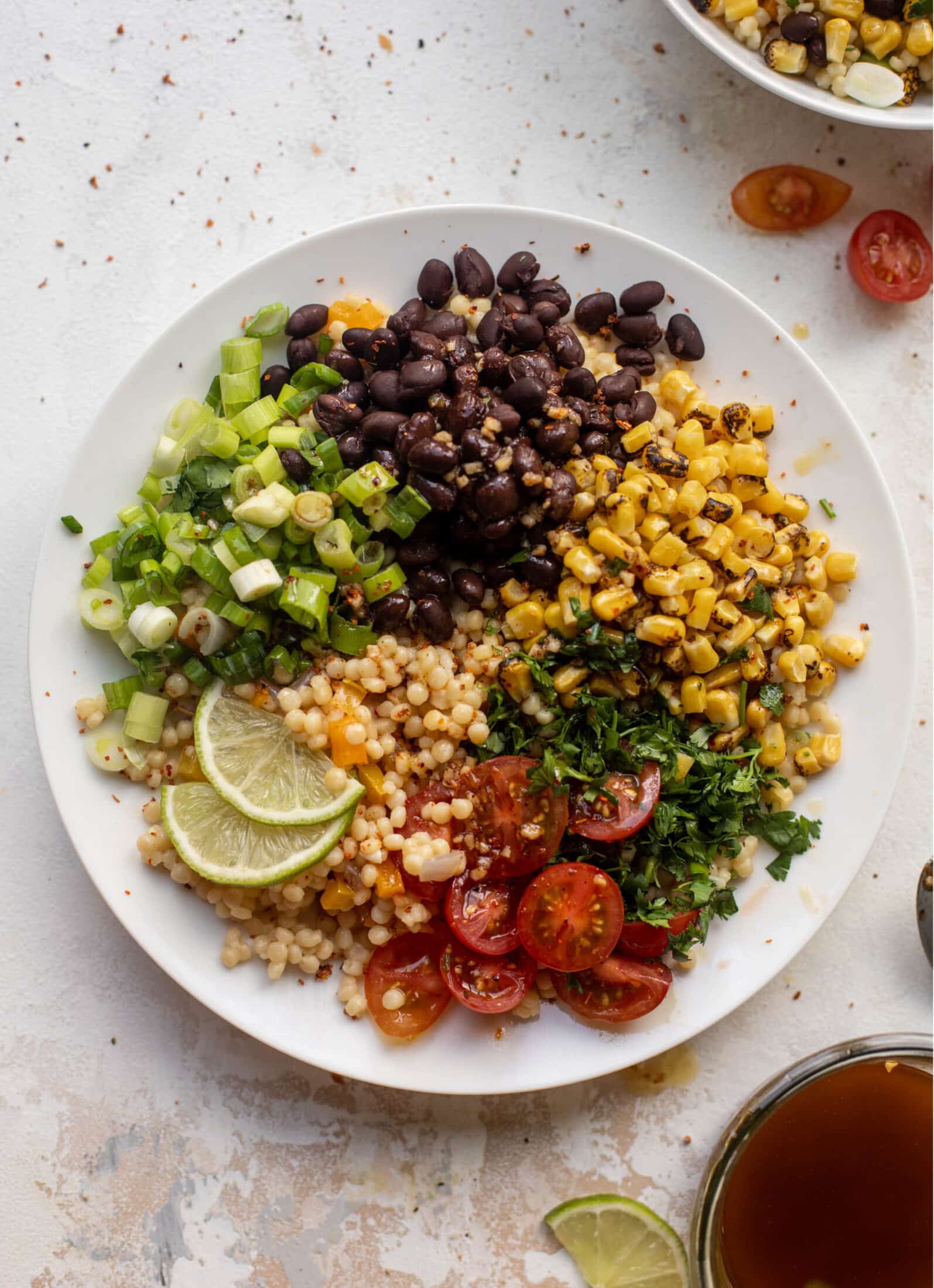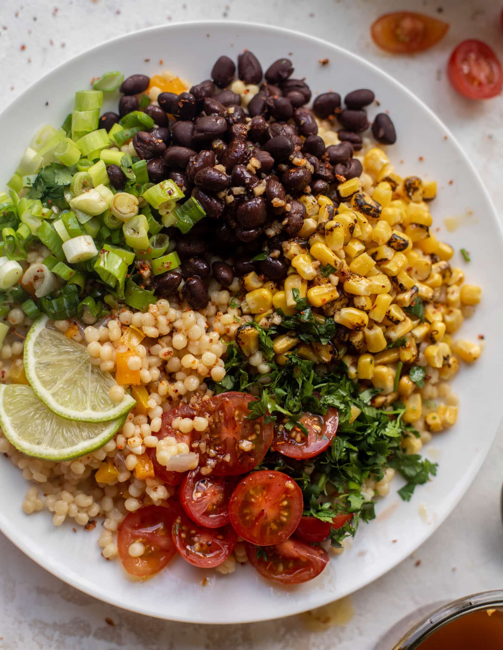 - Divide the couscous into two bowls (or even four bowls for a smaller side-like portion). Top with the black beans, tomatoes, corn, green onions and cilantro. Drizzle with the chili lime dressing.