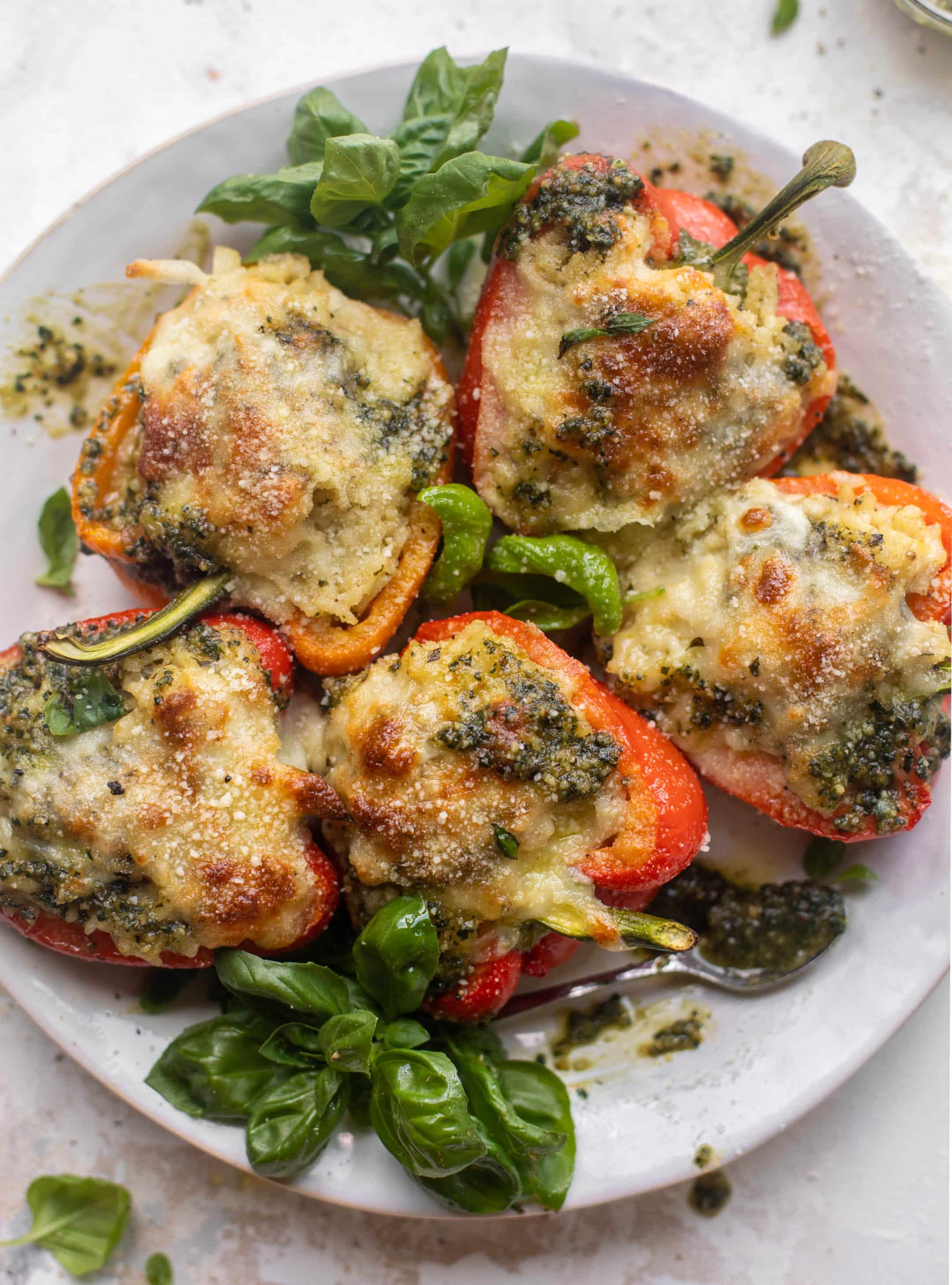 Pesto risotto stuffed peppers for a fun mid-week meal.