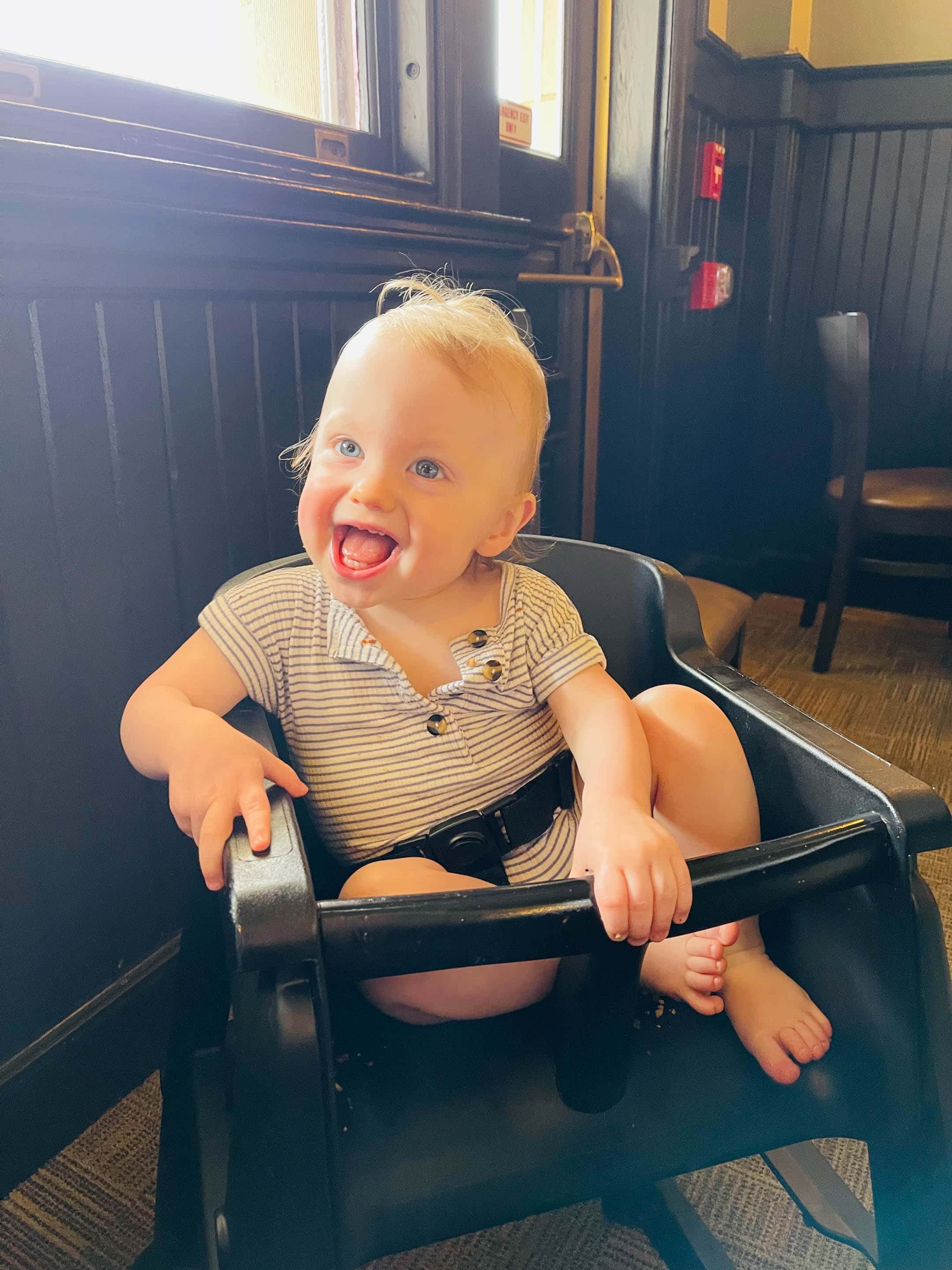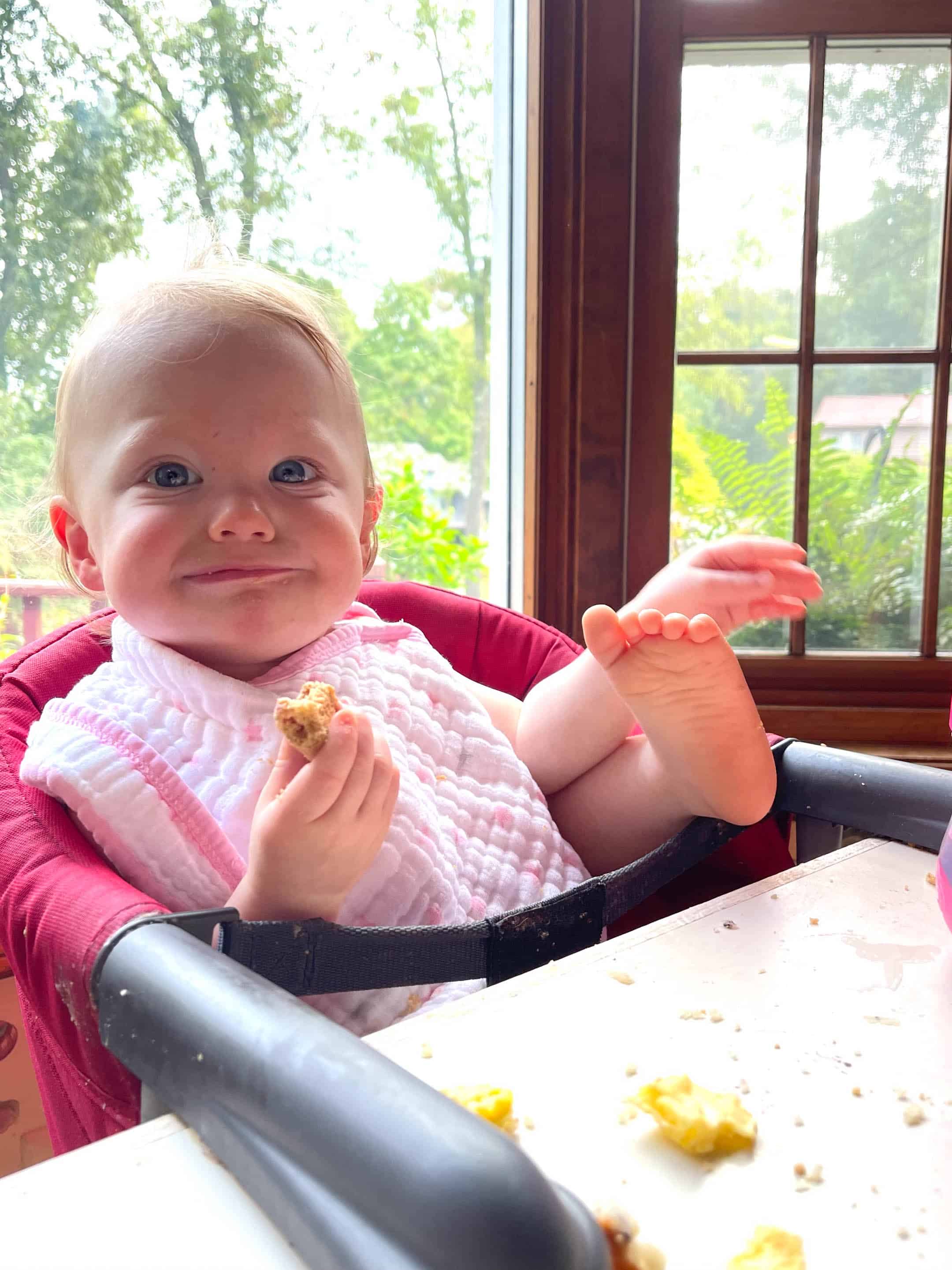 We used that same table-attaching high chair when mine was little and he, too, went through a phase of kicking back with a foot up while eating. Cutest thing ever!