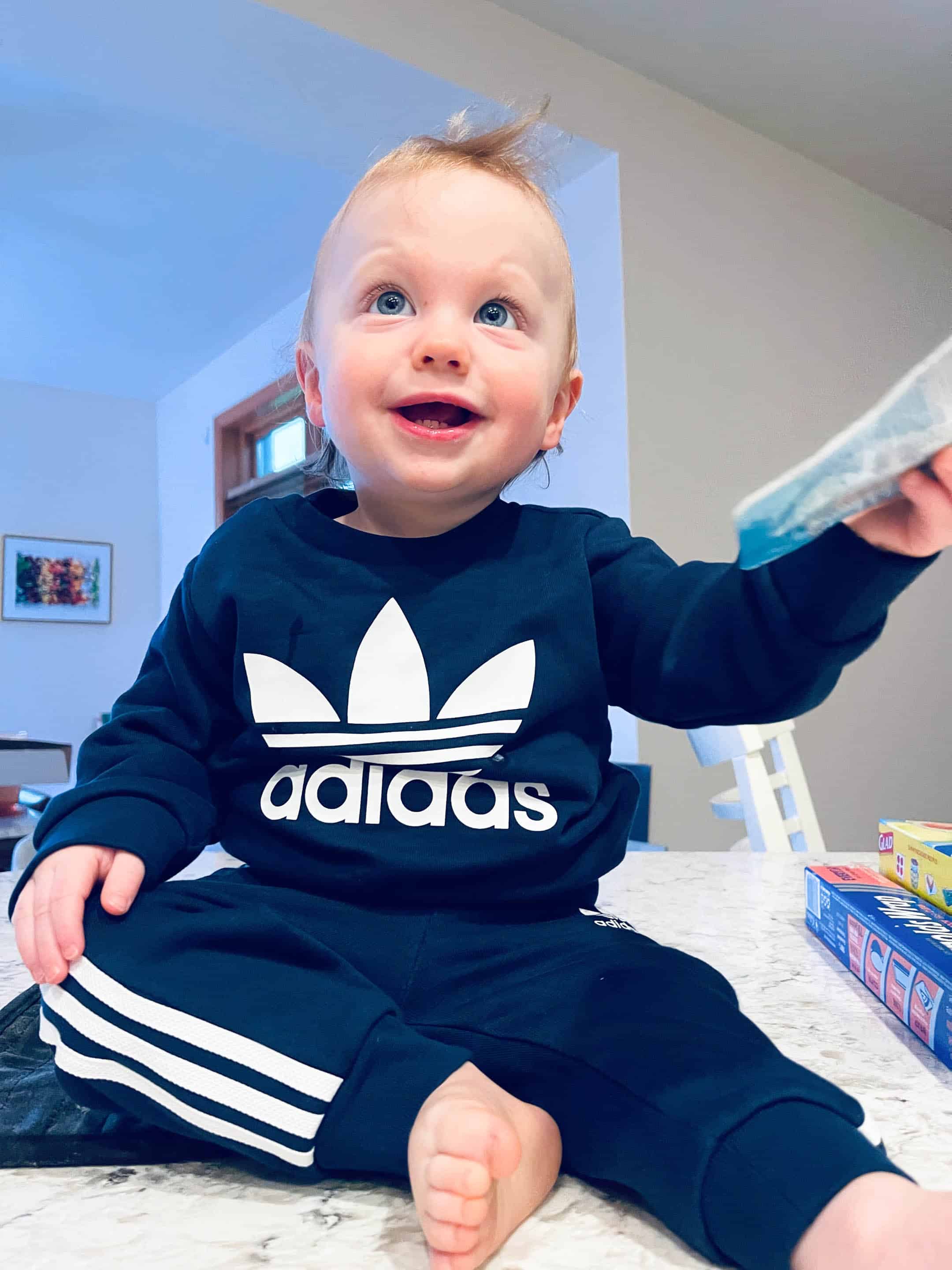We’re still very into wearing things on our head. This sheer scarf that came in a lovevery box is his current favorite.