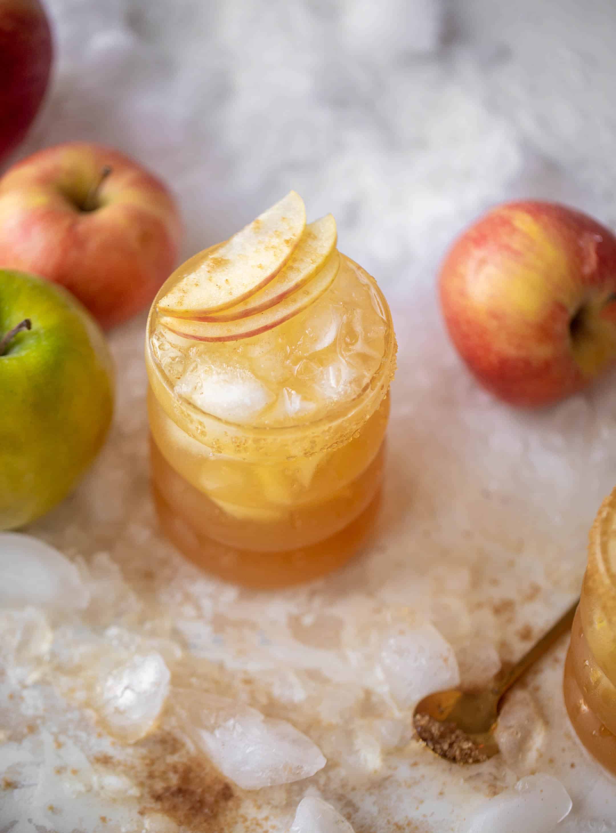 - Fill a cup with crushed ice. Add the apple cider and vodka, stirring to mix. Add in the ginger ale. Taste and add more ginger ale if you’d like. Garnish with sliced apples!