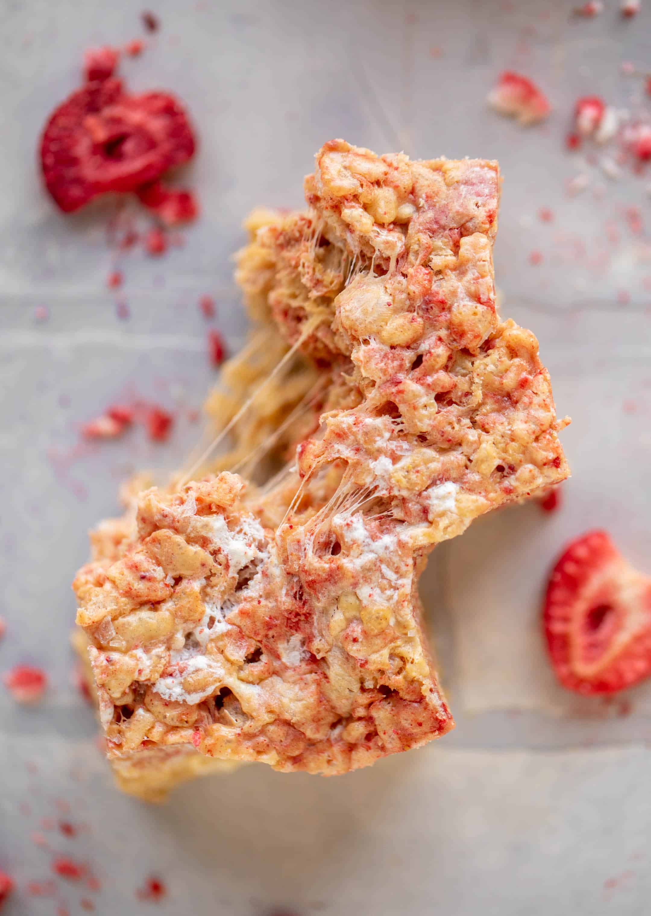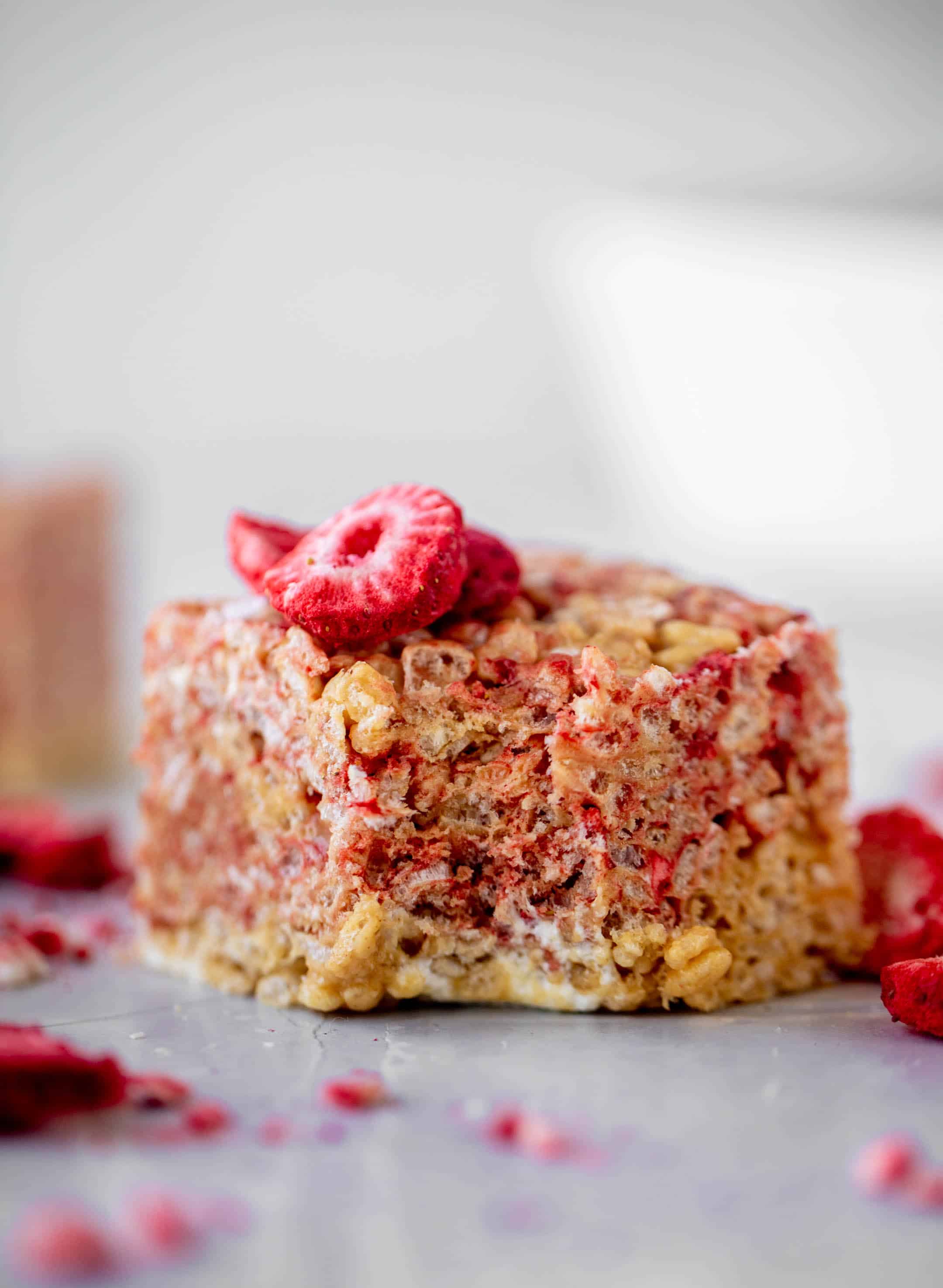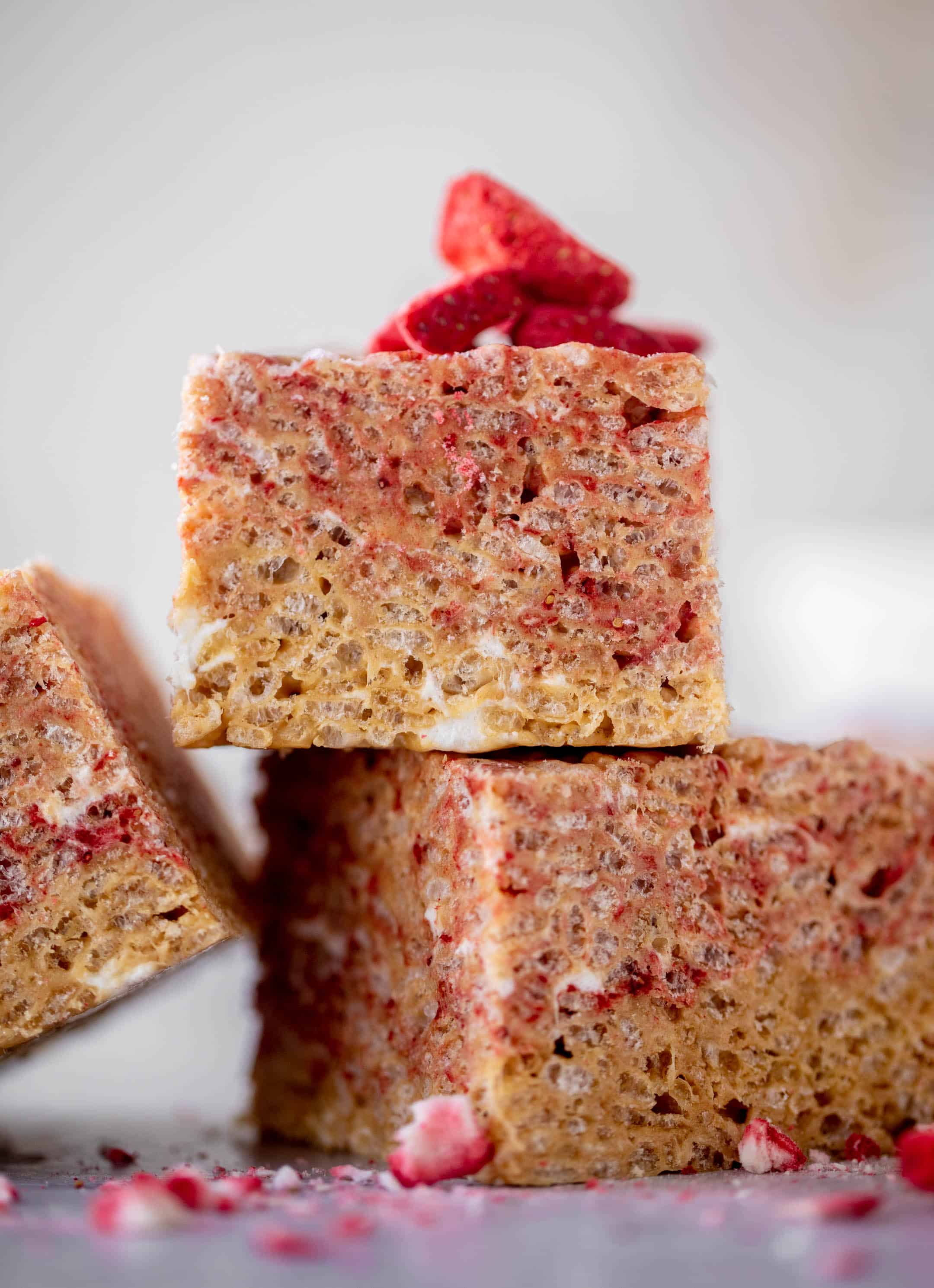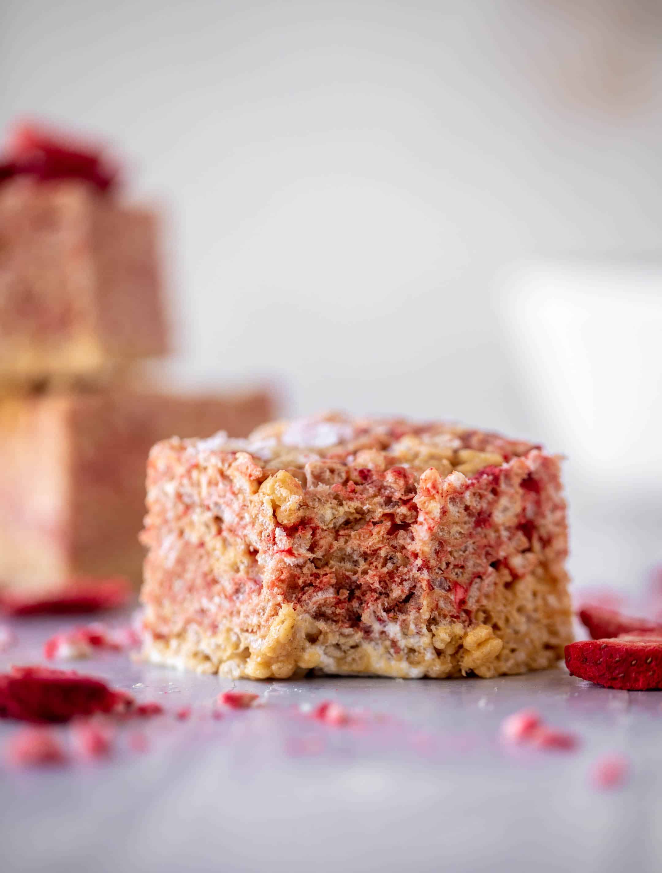 Making them is super simple. I use my peanut butter rice krispy treats recipe, stir the crushed freeze dried strawberries into half of the mixture, then layer them. As you press them into a dish, the strawberry flavor does mesh into most of the peanut butter, but in some of the photos you can see how it’s layered.