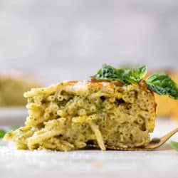 This pesto pasta pie is super delicious, satisfying and fun to eat! Bucatini is mixed with a cheesy filling and your favorite pesto and then baked until it comes together with the crunchiest outside. Serve alongside a salad and enjoy!