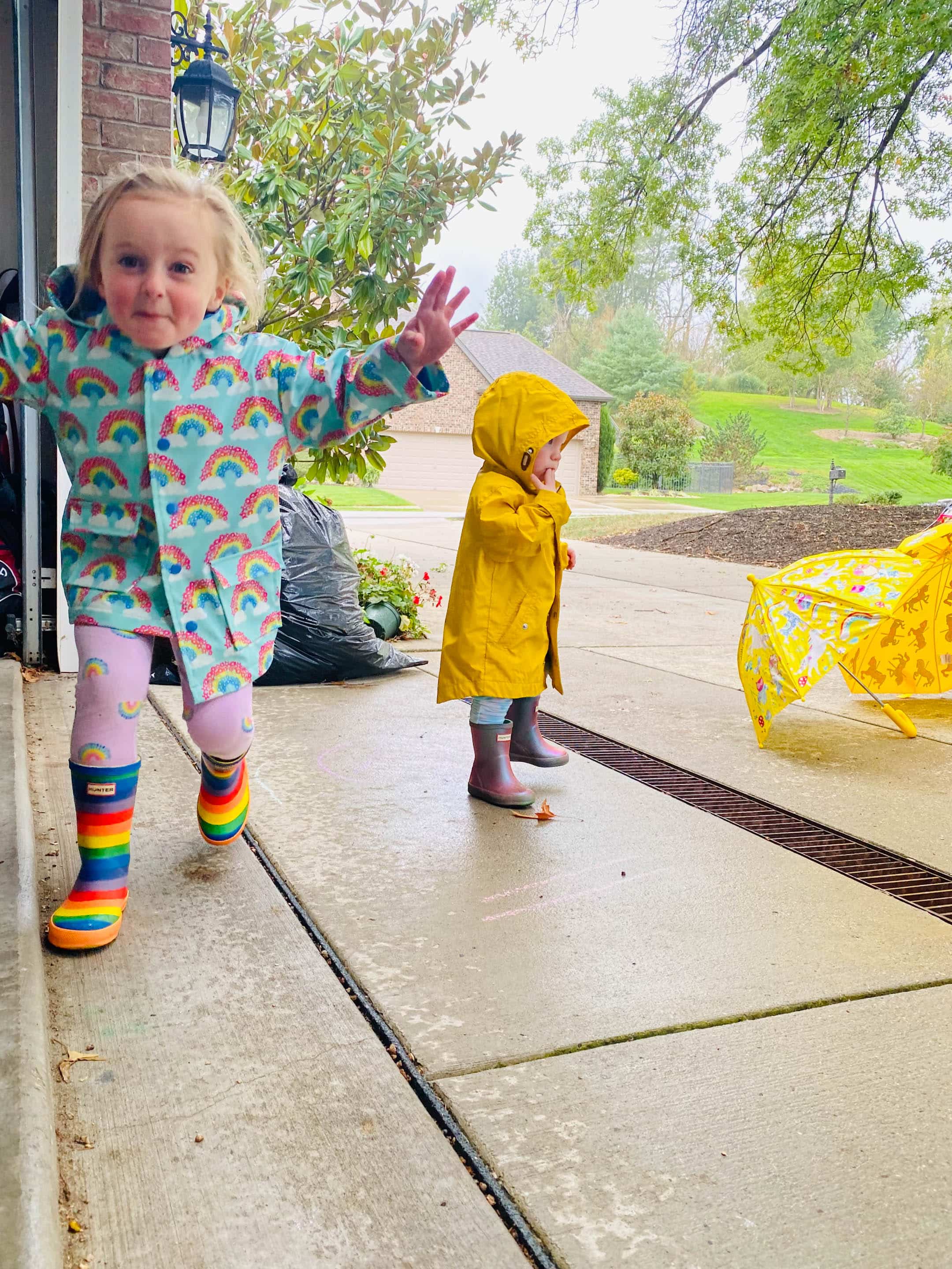Rainy day. Jordy in Max’s old coat and Emila’s old boots. Hands in mouth because TEETH. P.S. do you think Emilia likes rainbows? Haha.