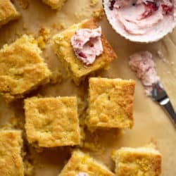 This brown butter cornbread is tender and fluffy with an incredible savory, caramelly flavor. Top it with salted cranberry butter for the perfect combination!