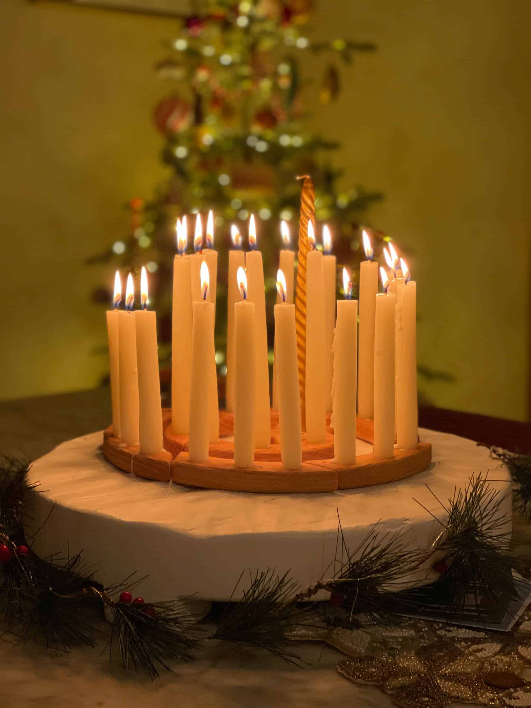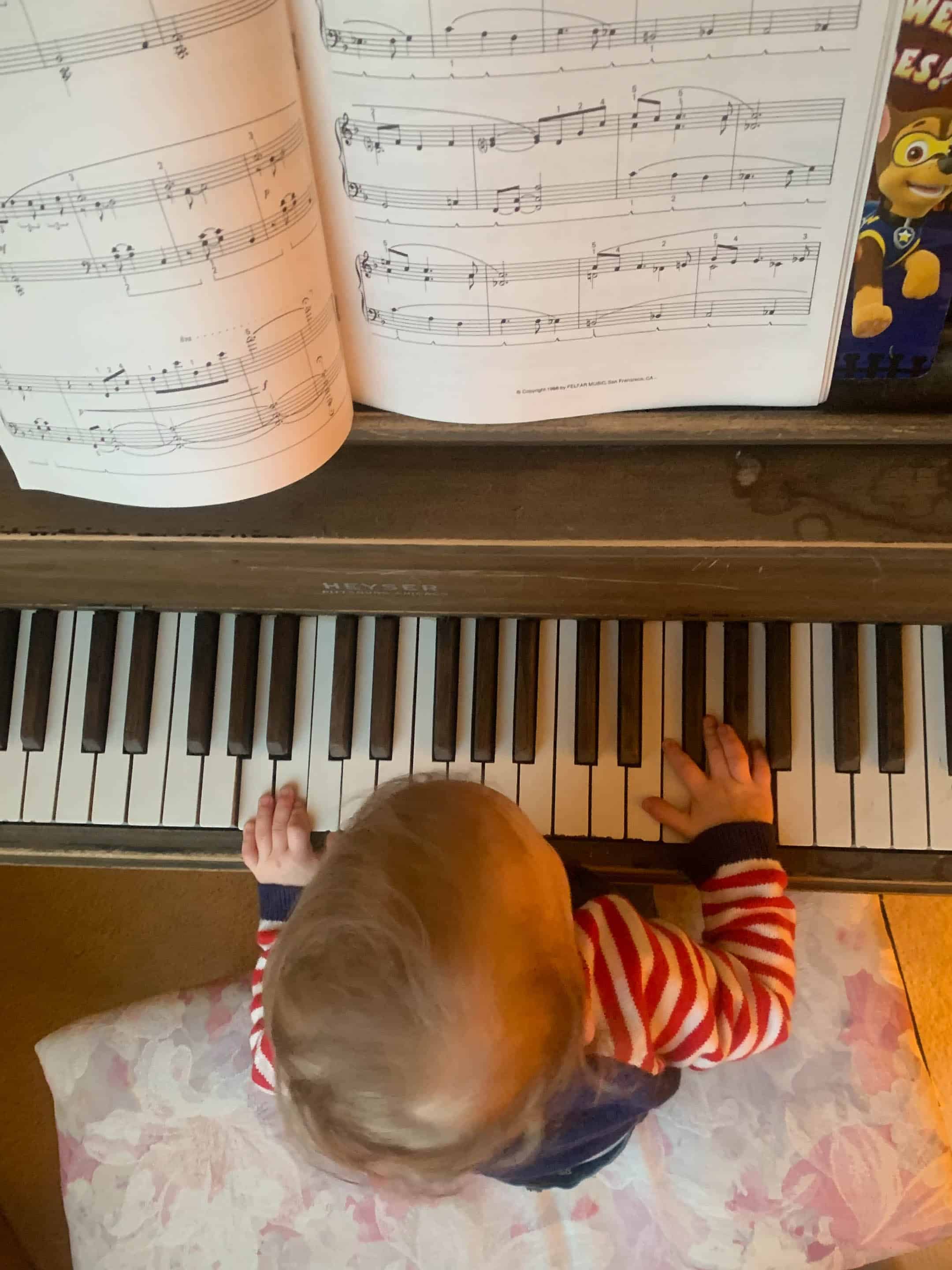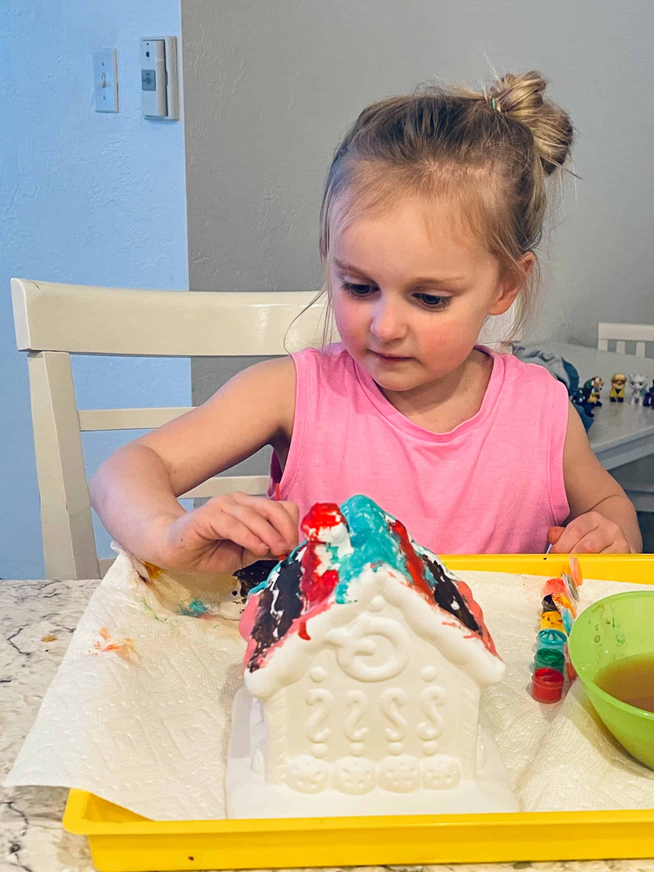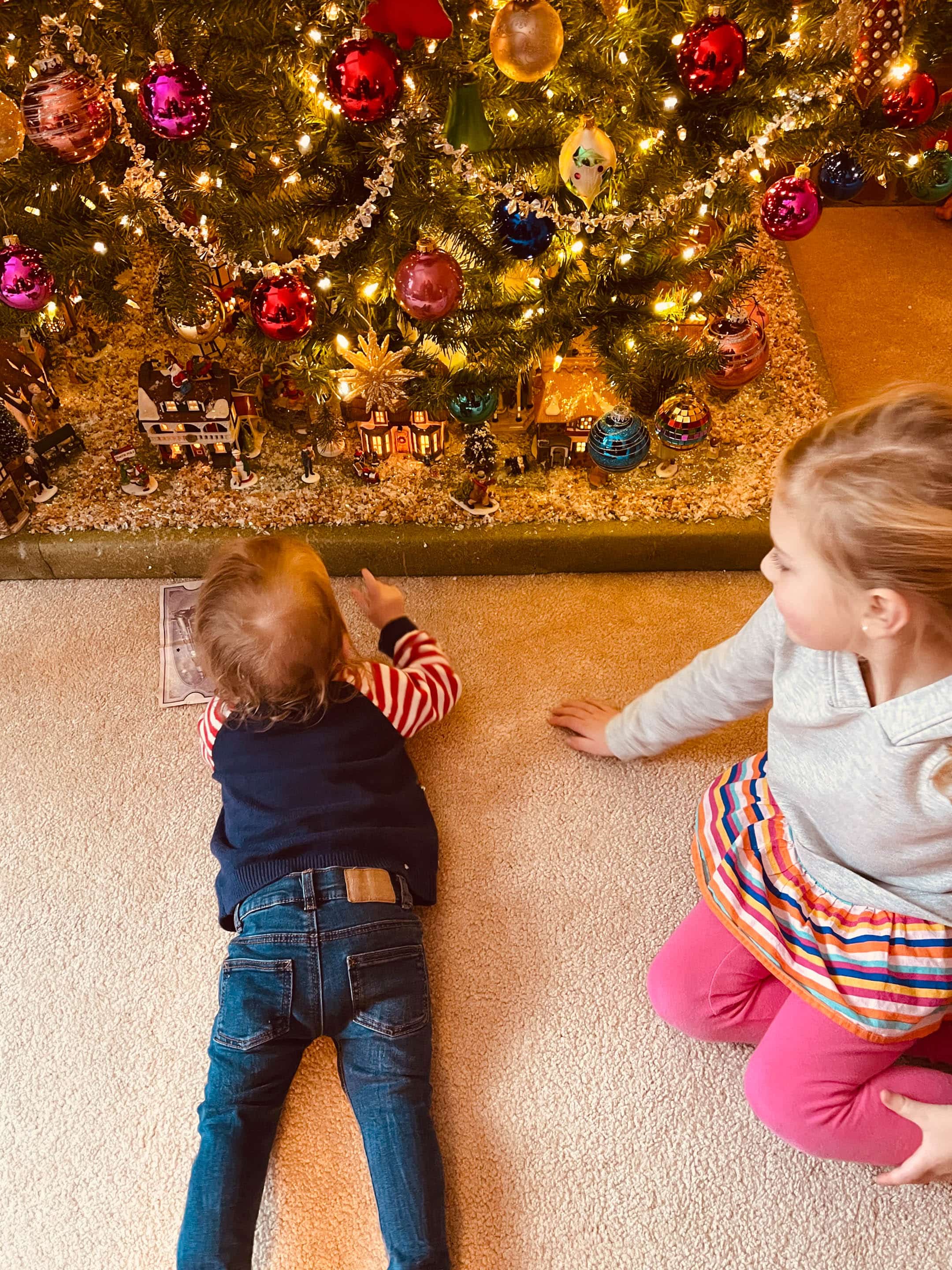 I love how Jordan gets on his belly to look at my mom’s village under the tree.