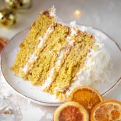 This spiced orange cake is a classic orange cake with a holiday twist! Cinnamon, allspice and nutmeg turn this into a warm cake hug. Topped with cream cheese frosting and coconut – it’s festive and delicious!