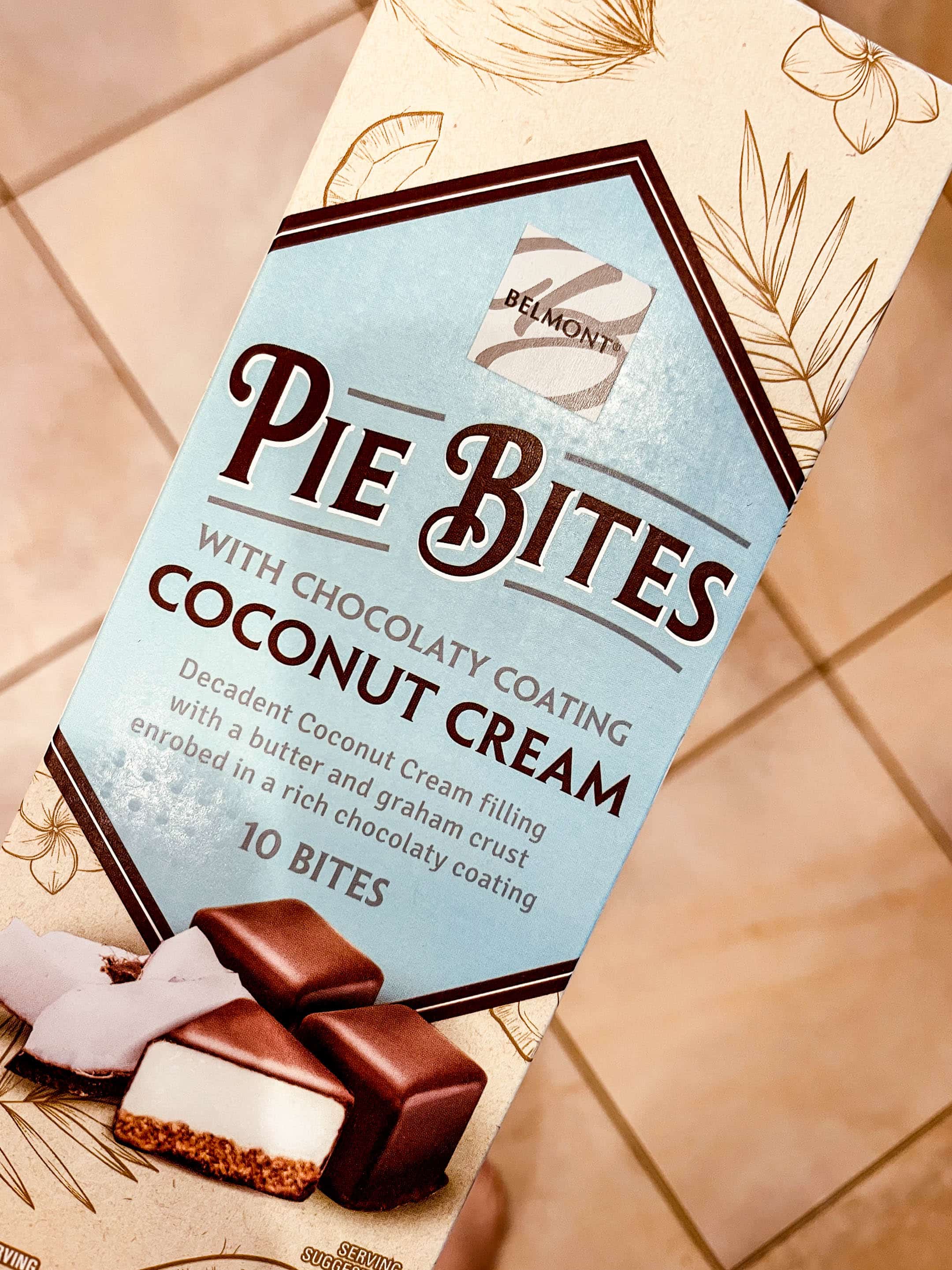 ALDI Belmont Coconut Cream Pie Bites. Um, these are unreal. New favorite treat. They are tiny frozen squares and perfect for a bite size treat after dinner. The coconut are my favorite but I also really like the banana.
