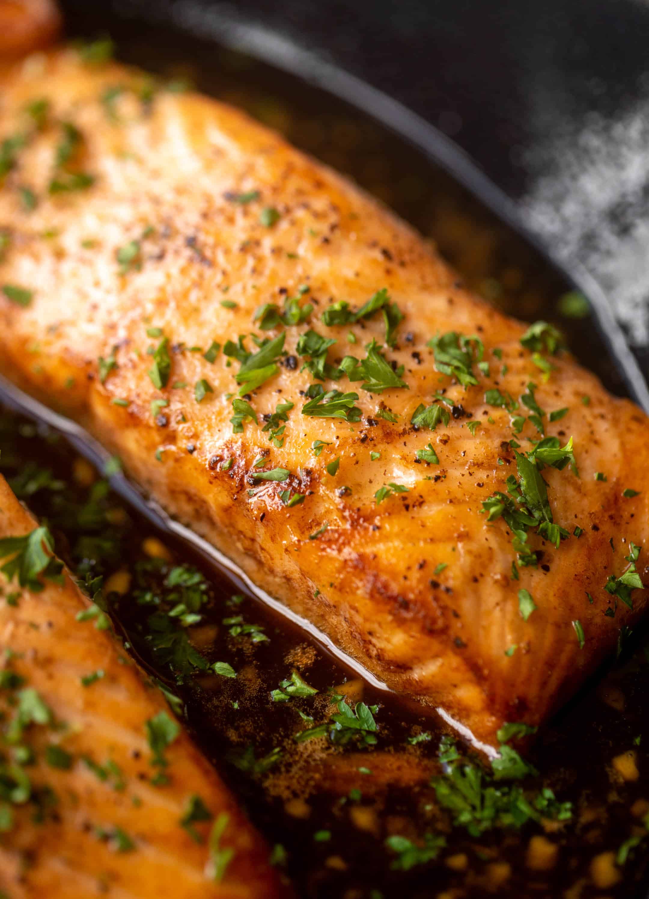 This sticky garlic butter salmon is a delicious, easy way to make salmon that everyone loves! It has a wonderful yet neutral enough flavor profile that you can serve it with just about anything. The outside is crisp and the inside is buttery. Delish!
