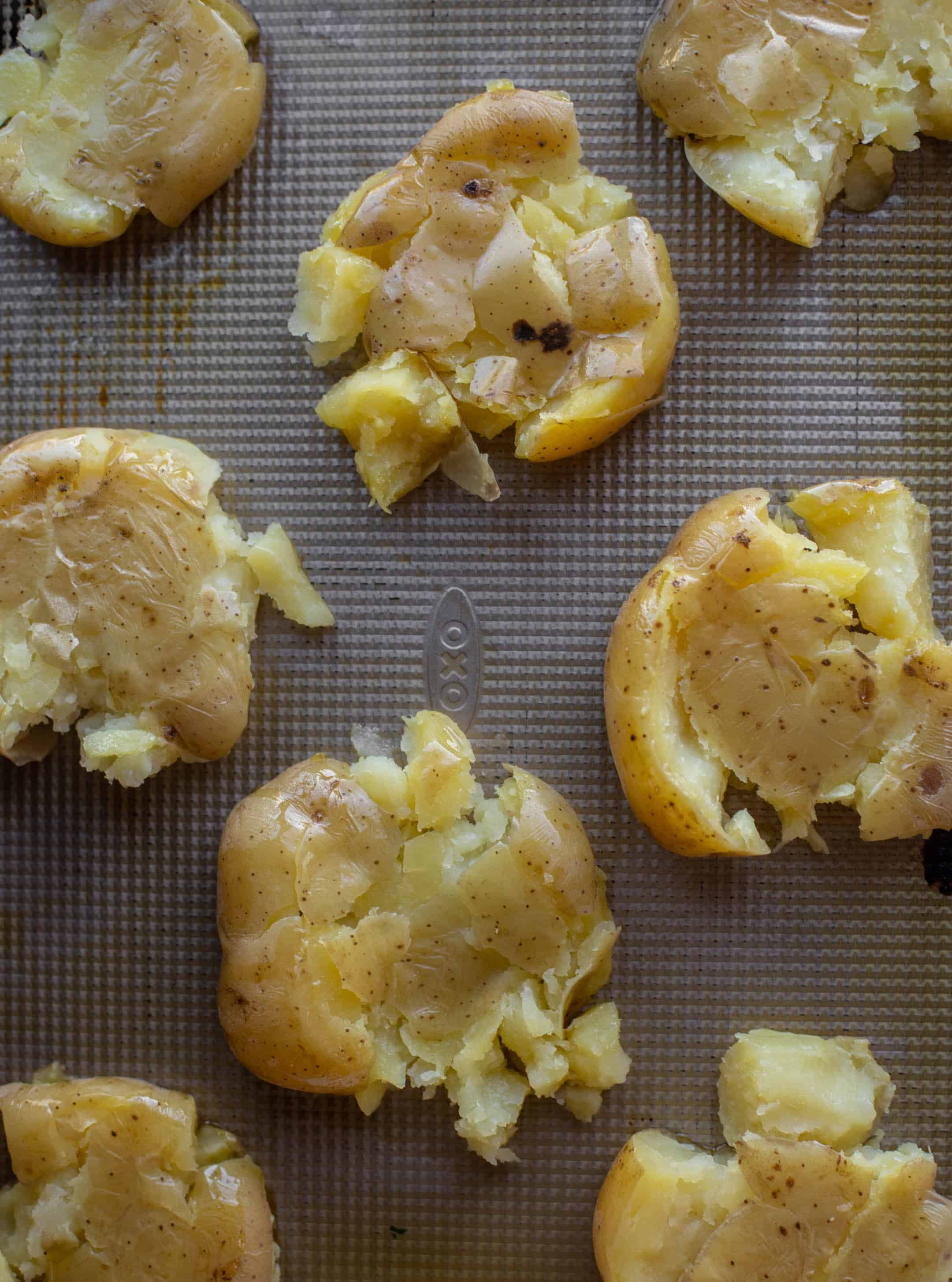 - Brush a baking sheet with 1 ½ tablespoons of olive oil. Place the potatoes on the sheet. Use your hand or the bottom of a glass to smash them once, trying to keep them in one piece. Drizzle or spray more olive oil on top of the potatoes. Sprinkle the potatoes with a big pinch of salt, pepper and garlic powder.