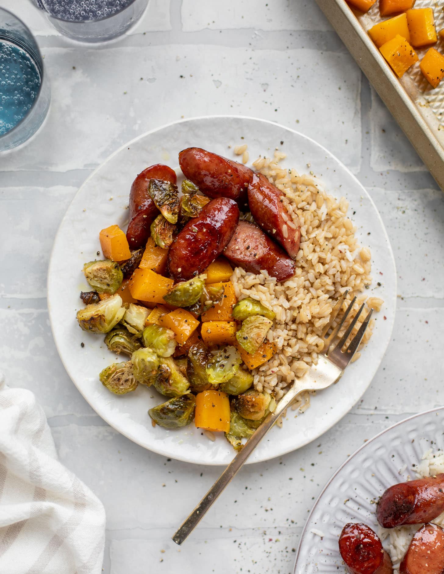 Sheet pan maple sausage, brussels and squash.