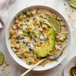 So, here’s the thing. We LOVE white chicken chili. I’ve had many different versions of it, most were delicious. I’ve had heartier bowls, brothier soups and creamier chilis, all called white chicken chili. I also have a recipe for white chicken chili in The Pretty Dish! We love it.