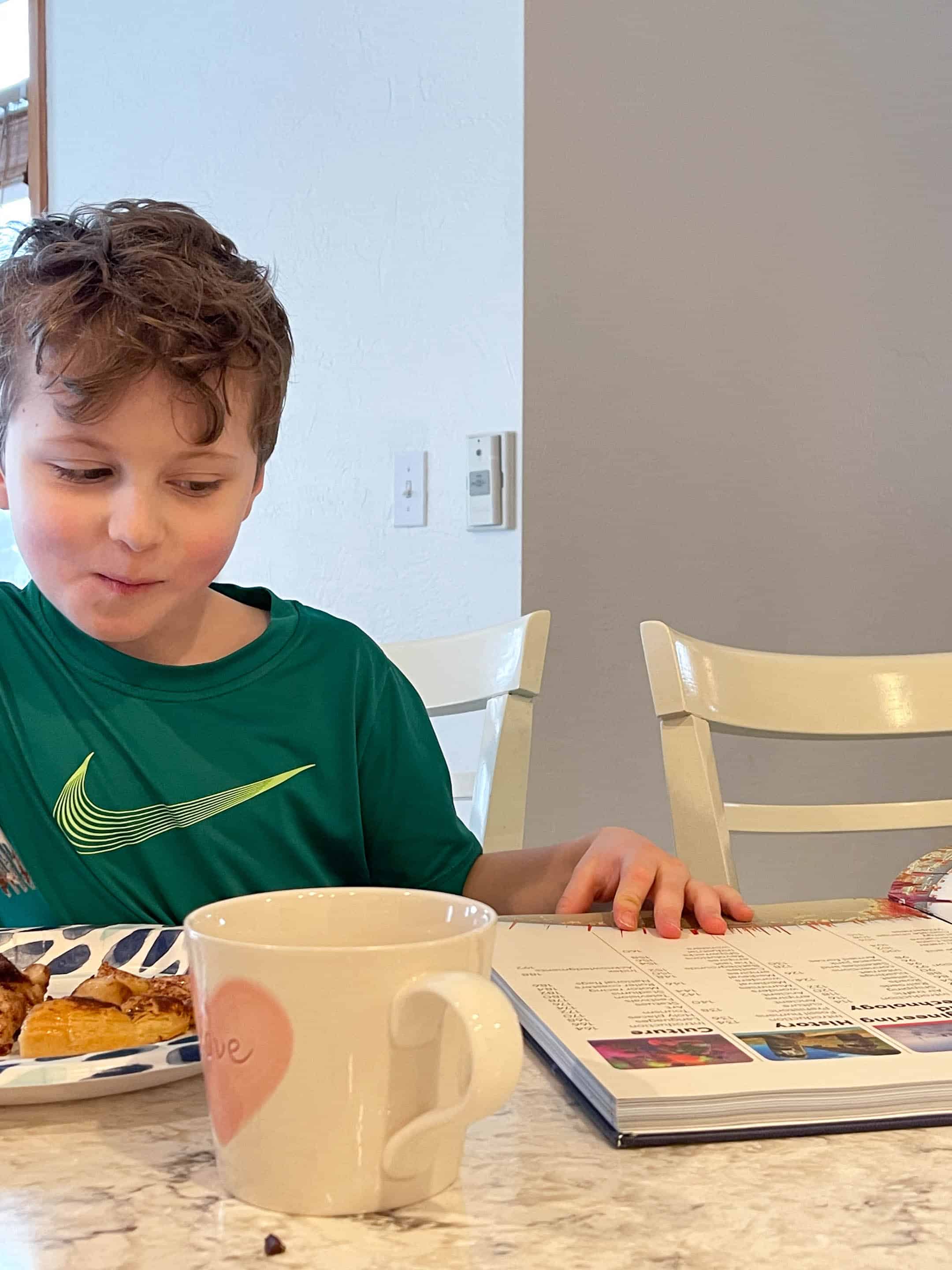 Cinnamon rolls on paper plates, milk and geography books for breakfast.