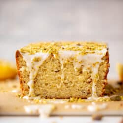 This lemon loaf cake is studded with pistachios and drenched in a lemon glaze. It’s sweet and light and refreshing, plus could not be more perfect for spring.