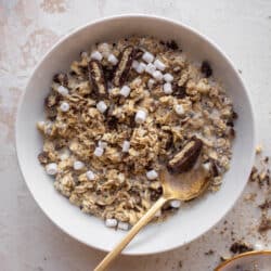 S’mores overnight oats taste like a marshmallow chocolate explosion in a bowl. Chewy overnight oats are studded with mini marshmallows and mixed with graham crumbs for the most delicious flavor. Serve with a mini chocolate covered graham cracker on top!