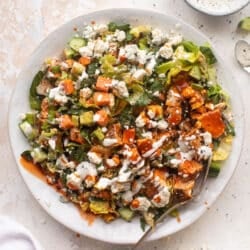 In addition to all these wonderful flavors, I make my homemade yogurt ranch to drizzle on top. Sometimes I do a drizzle of wing sauce and ranch separately. Sometimes I mix a few tablespoons of wing sauce directly into my ranch, making a buffalo ranch dressing. Both work, both are delicious and this chopped salad will have everyone in awe.