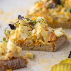 I have a recipe for the best egg salad ever – I make this probably every other week. It’s truly the BEST!! We all adore it, even the kids. It’s a major staple here. And while nothing can quite beat that recipe, I wanted to share this pickle lovers’ version just in case you’re a pickle freak like I am. This is the one I make when it’s just me.